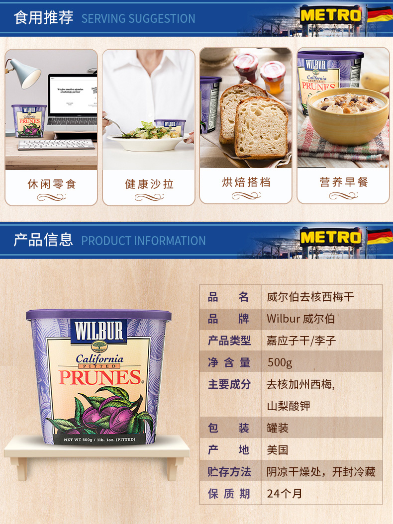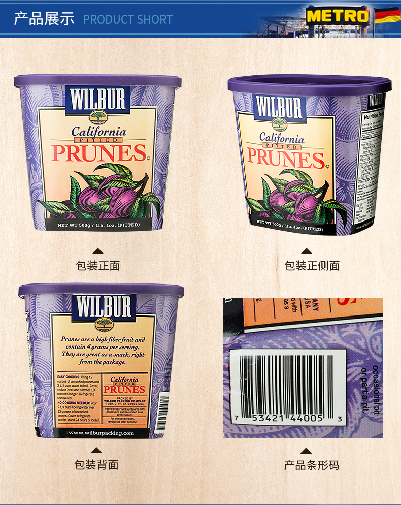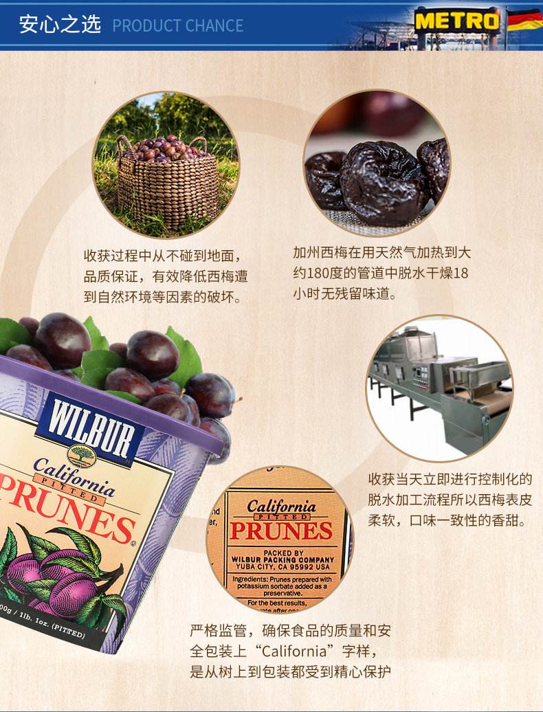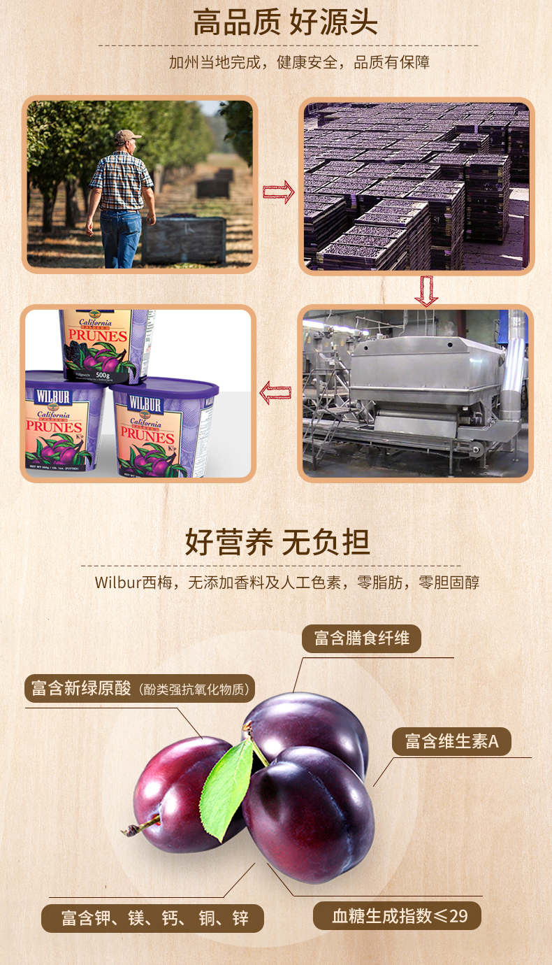 Wilbur去核西梅干,美国加州进口,本地源头制作,收获过程中不碰触地面,当天立即进行控制化的脱水加工流程,所以西梅表皮柔软,口味一致性的香甜,无添加香料及人工色素,零脂肪,零胆固醇,营养无负担。