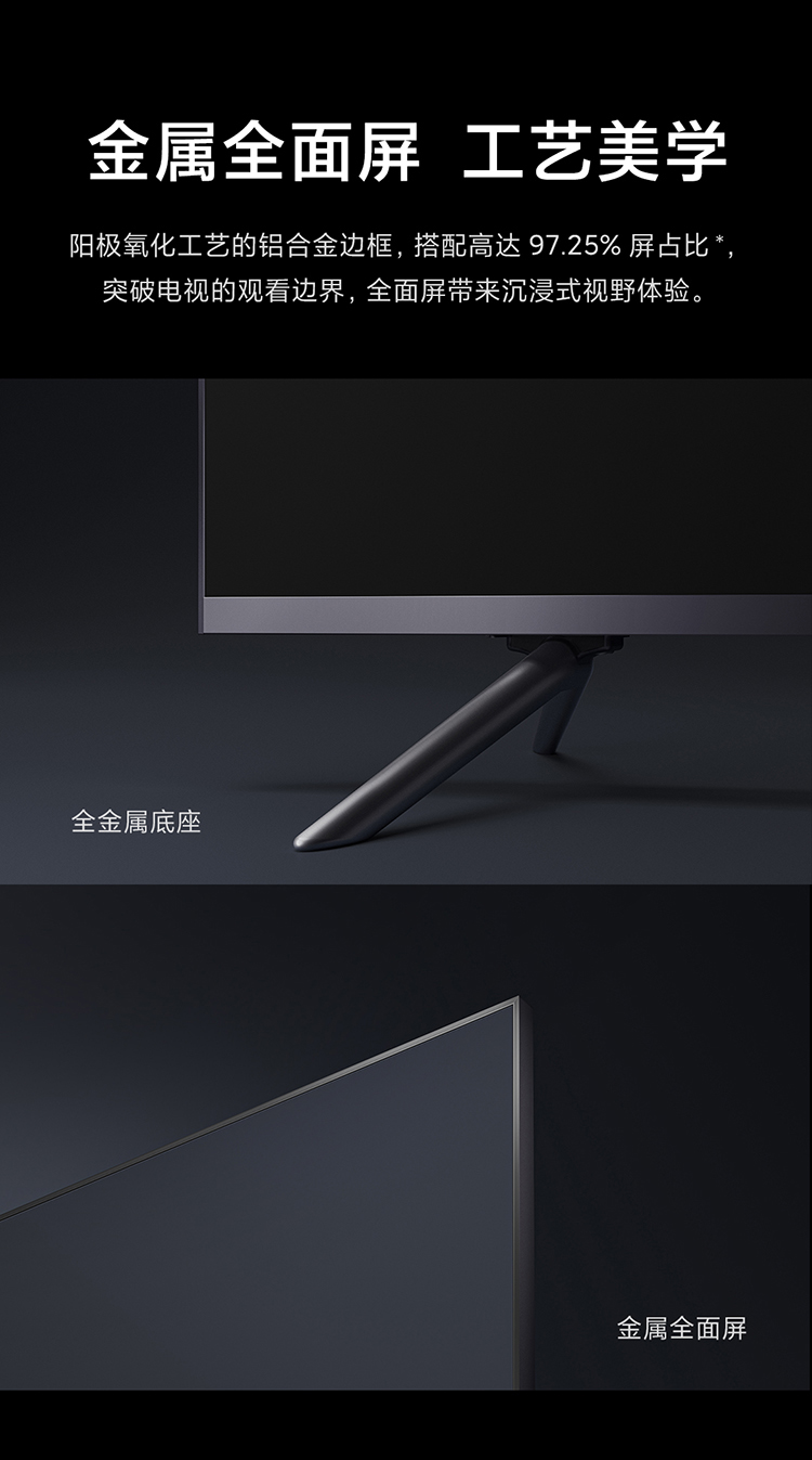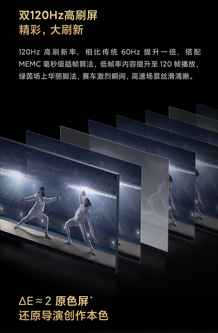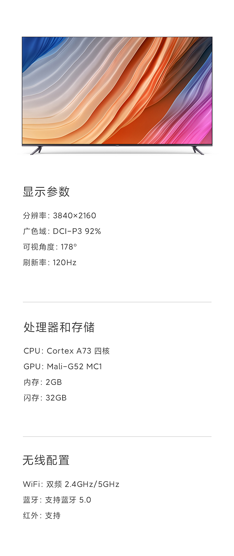 采用4K全面屏设计,屏占比达到97.25%,拥有4DCI-P3 92%广色域覆盖范围,支持双120HZ高刷、MEMC运动补偿,搭载90分区动态背光系统,AI动态场景识别,智能调校色彩、清晰度、对比度,同时还支持杜比视界、HDR10+ 、HDR10和HLG。配置方面,搭载22nm制程MTK 9650电视芯片,四核A73 CPU 架构+Mali G52 MC1 GPU架构,配备2GB+32GB存储组合、HDMI 2.1标准接口。