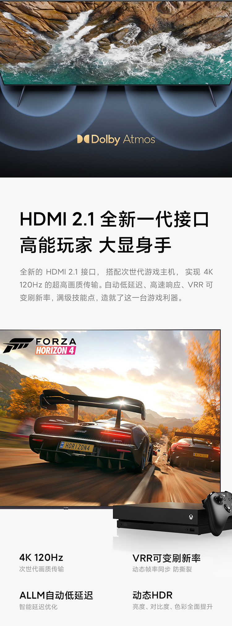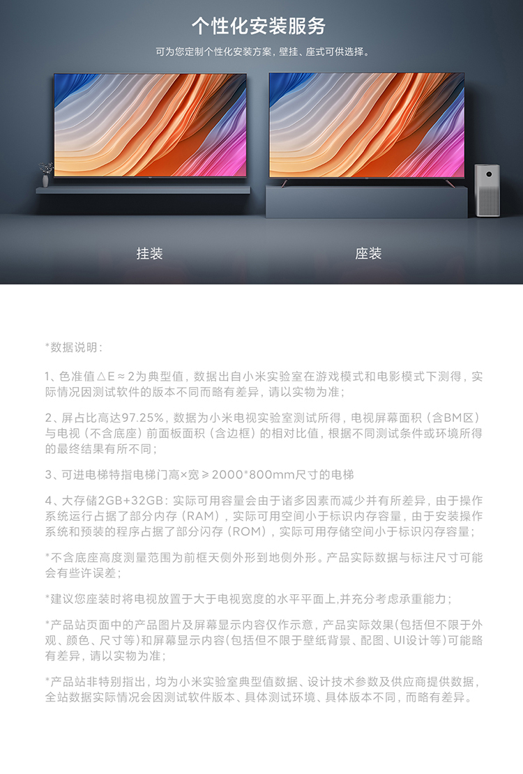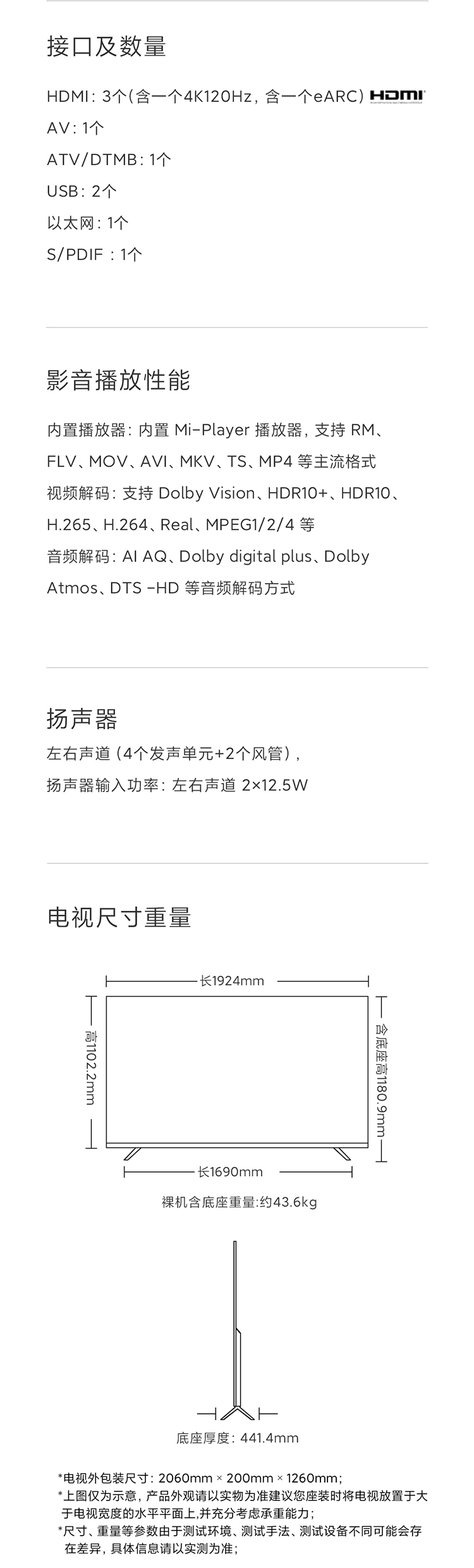 采用4K全面屏设计,屏占比达到97.25%,拥有4DCI-P3 92%广色域覆盖范围,支持双120HZ高刷、MEMC运动补偿,搭载90分区动态背光系统,AI动态场景识别,智能调校色彩、清晰度、对比度,同时还支持杜比视界、HDR10+ 、HDR10和HLG。配置方面,搭载22nm制程MTK 9650电视芯片,四核A73 CPU 架构+Mali G52 MC1 GPU架构,配备2GB+32GB存储组合、HDMI 2.1标准接口。