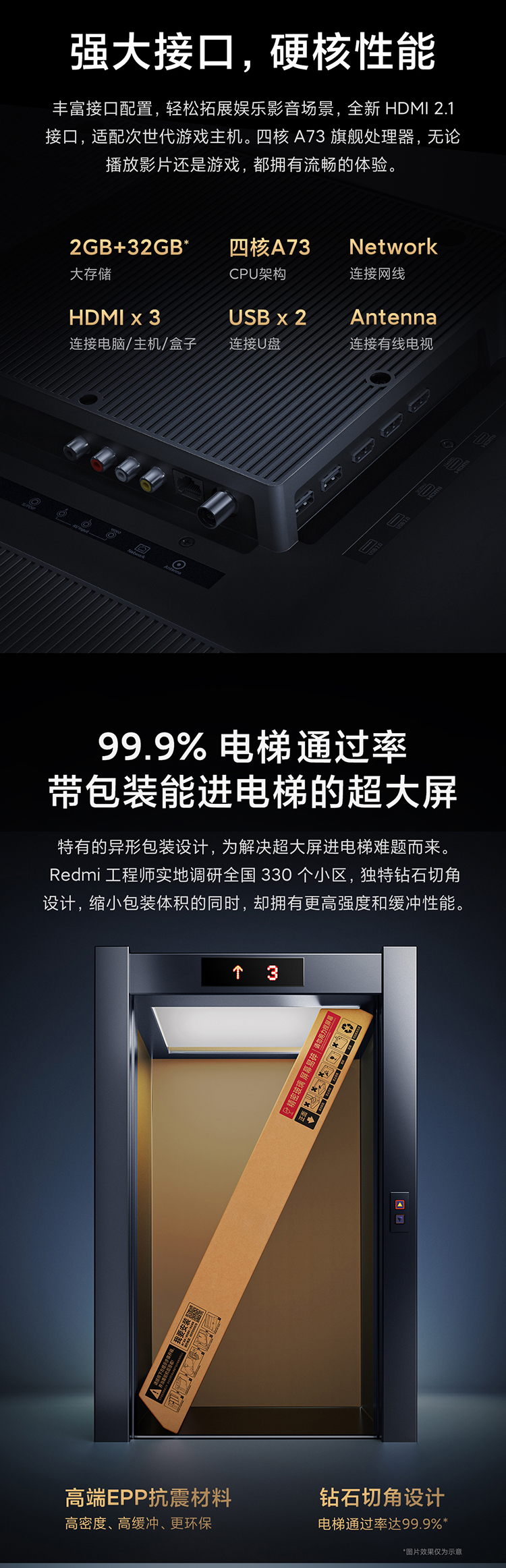 Redmi Max 86寸液晶电视首次采用自研的异形设计包装方案,将包装箱其中两边经过钻石切角处理,并搭配EPP缓冲材料,合理利用每一寸空间,让电梯通过率达到99.9%,解决了超大屏电视“不能带包装进电梯”的用户痛点。