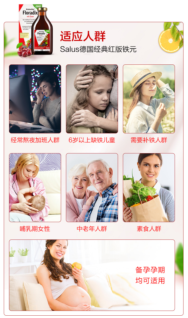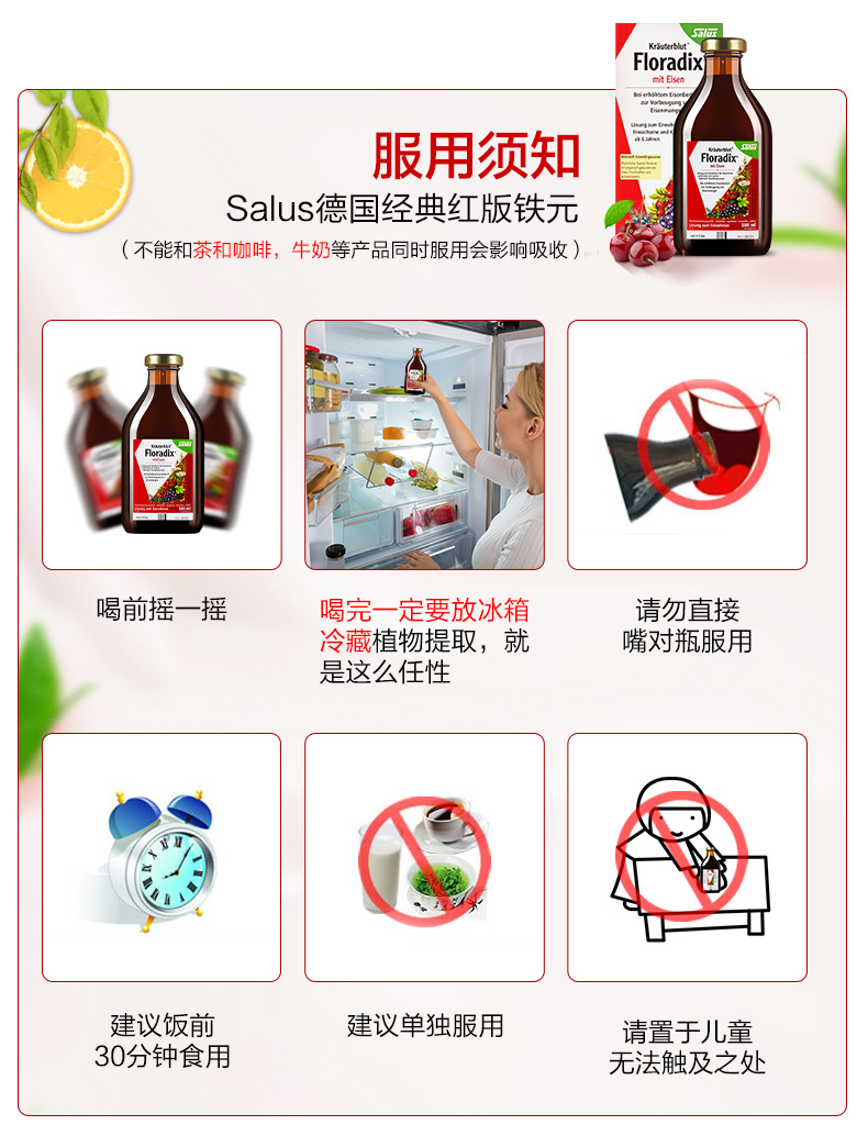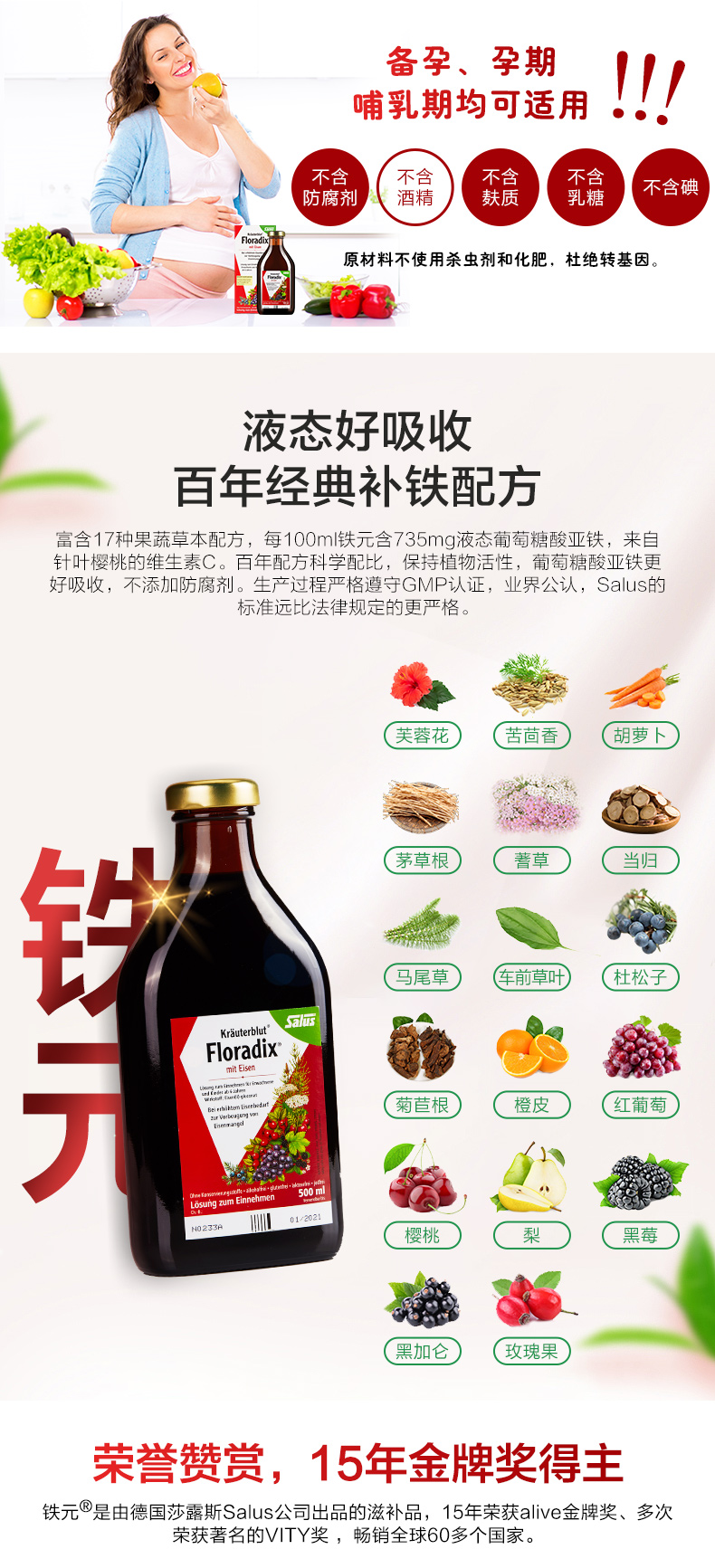 这款莎露斯Salus红铁元,德国原装进口,主要成分是铁元、水果浓缩汁混合物:黑加仑果汁、黑莓、梨、樱桃、葡萄、蜂蜜、玫瑰果、香橙;水芙蓉花、苦茴香、当归根等。