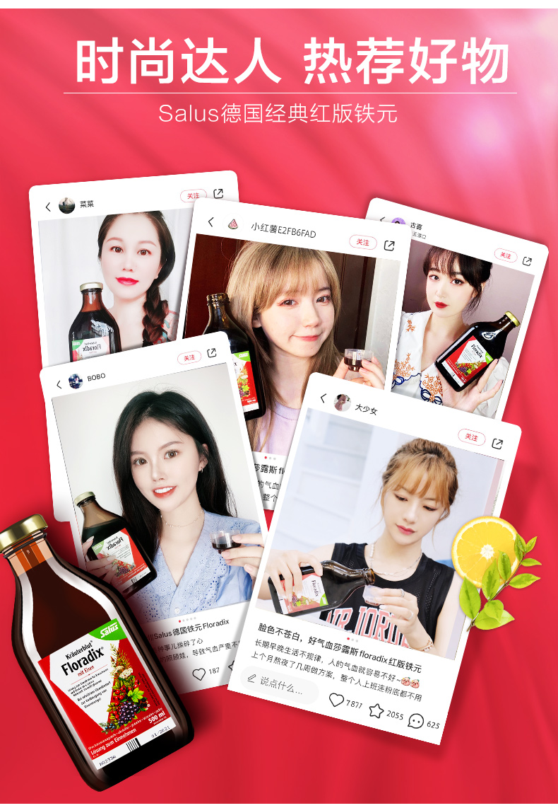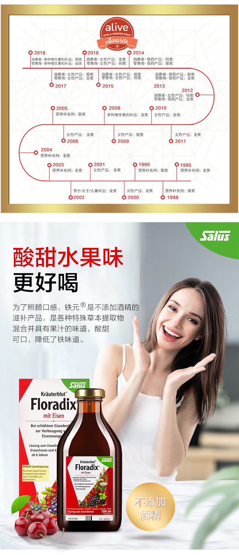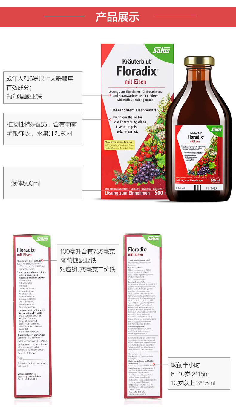 这款莎露斯Salus红铁元,德国原装进口,主要成分是铁元、水果浓缩汁混合物:黑加仑果汁、黑莓、梨、樱桃、葡萄、蜂蜜、玫瑰果、香橙;水芙蓉花、苦茴香、当归根等。