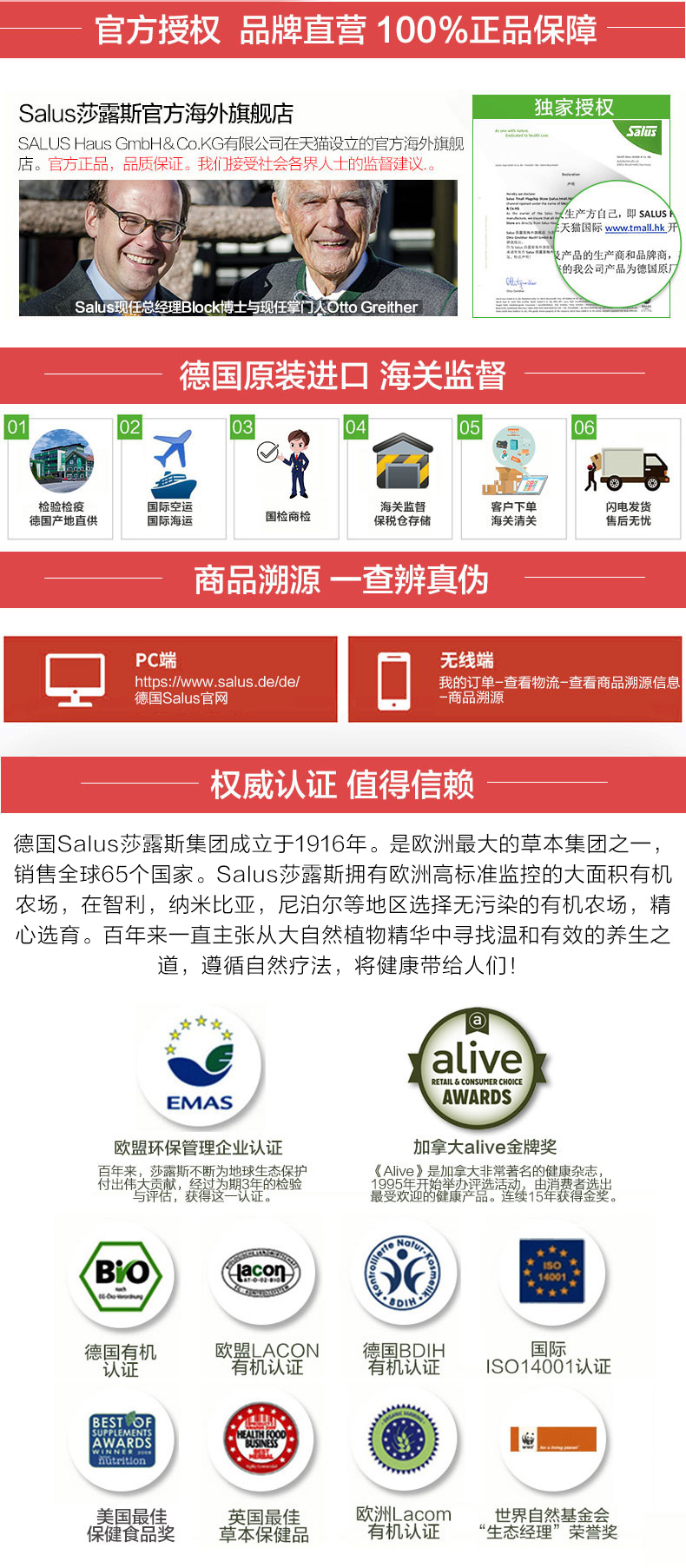 莎露斯品牌成立于1916年,总部位于德国,至今已经有一百年的历史,是欧洲最大的草药集团。公司出品的从天然植物中萃取的健康食品,在德国家喻户晓。Salus以及其旗下品牌如Salusflordix、Dr.Dunner等已遍布世界50多个国家和地区。