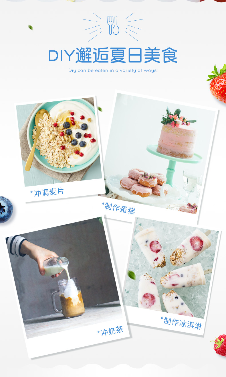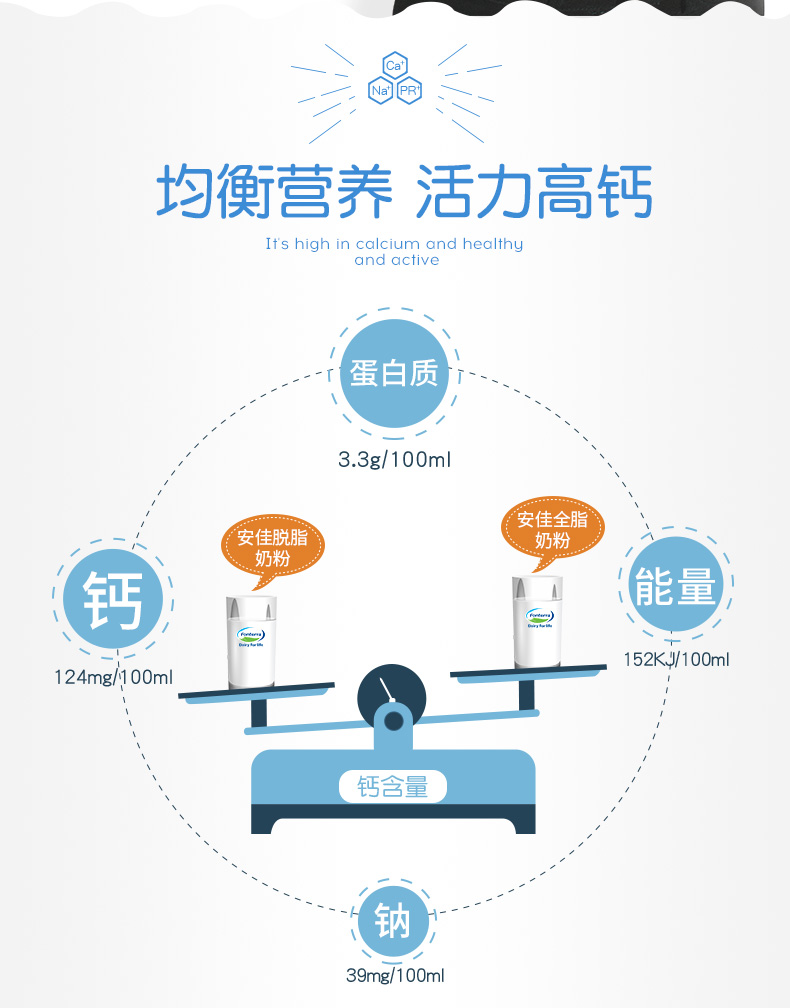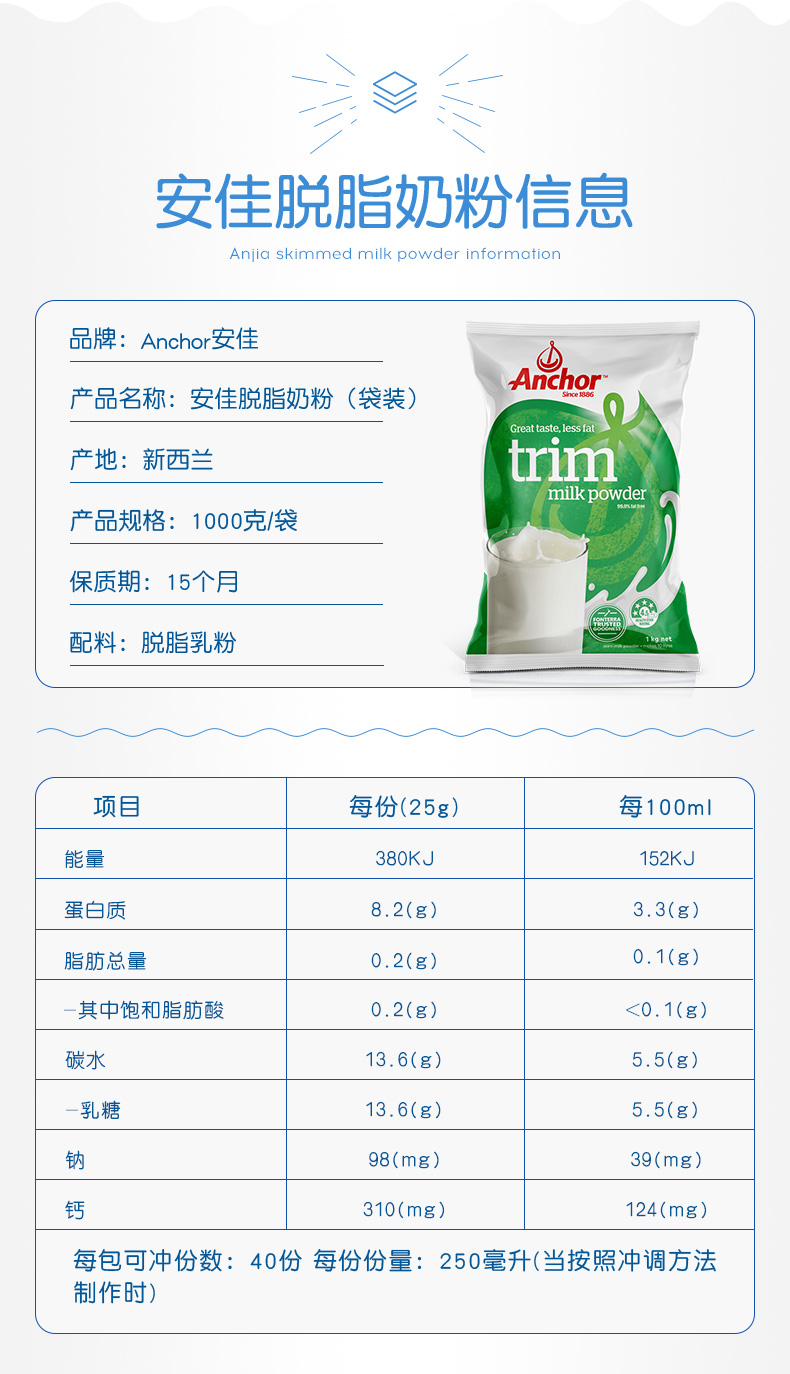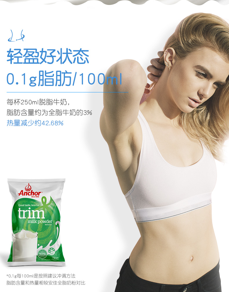 这款安佳 脱脂奶粉,每100ml仅含脂肪0.1g,约是全脂的3%,热量减少约42.68%;脱脂不脱钙,每100ml钙含量约是3.3g,均衡营养,非常适合减肥期间人群饮用。30秒速溶,不结块易冲泡 ,按250ml一杯冲泡,可冲泡40杯。除了直接饮用外,还可冲调咖啡、麦片、奶茶、制作冰激淋等。