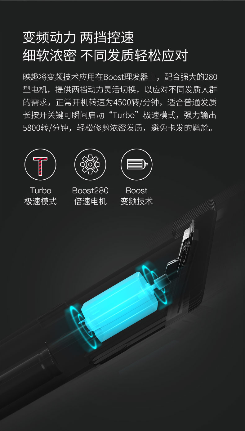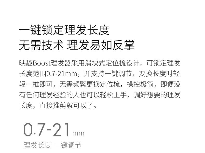 理发器刀头采用纳米陶瓷材质,表面比普通理发店使用的不锈钢刀头光滑,理发时噪声更低,也不易发热。理发时可一键锁定理发长度0.7-21mm,不用担心剪得不好,直接平推理发就行。内置280型电机提供两档调节速度,既适合普通发质需要,又能满足浓密发质,避免卡发。