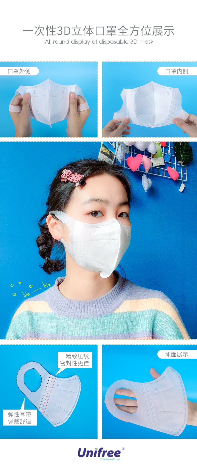 这款unifree 一次性3D立体口罩,外层无纺布,中间熔喷过滤布,内层无纺布,三层防护,过滤空气中的多种有害物质。立体剪裁,适合大多数脸型,舒适贴合,鼻梁处折角佩戴效果更贴合,密封性更好。无纺布耳带,透气,抗拉扯,佩戴舒适。