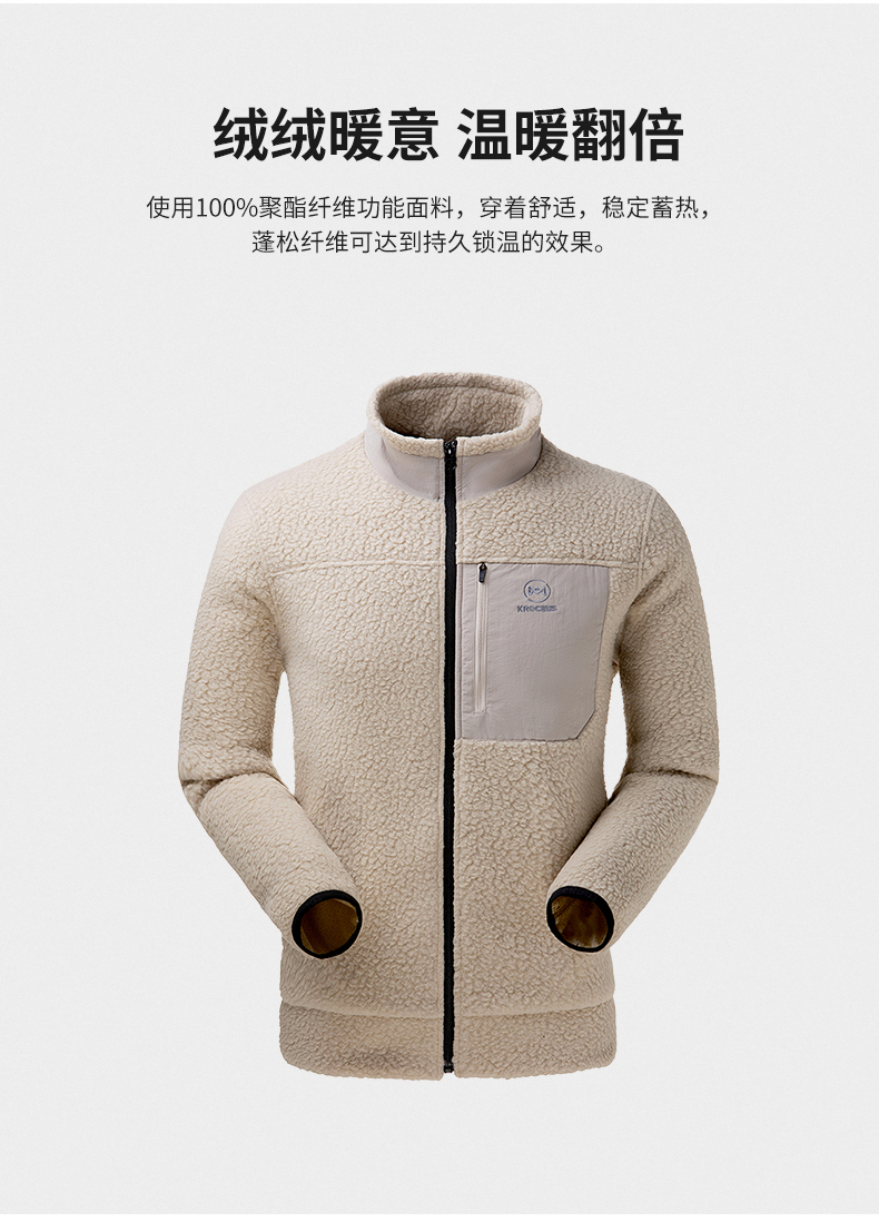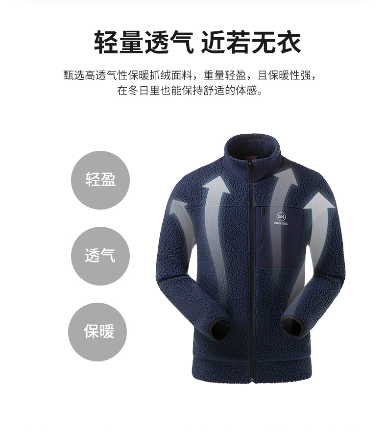 抓绒作为保暖面料,同样重量下的保暖效果,是棉的4-5倍、羊毛的2-3倍、比羊绒也略好一些。虽然还不如羽绒服,但速干透气的特征也是羽绒服不具备的,不像羽绒服上身显臃肿,可保持肩膀手臂和平常衣物同样灵活自如。