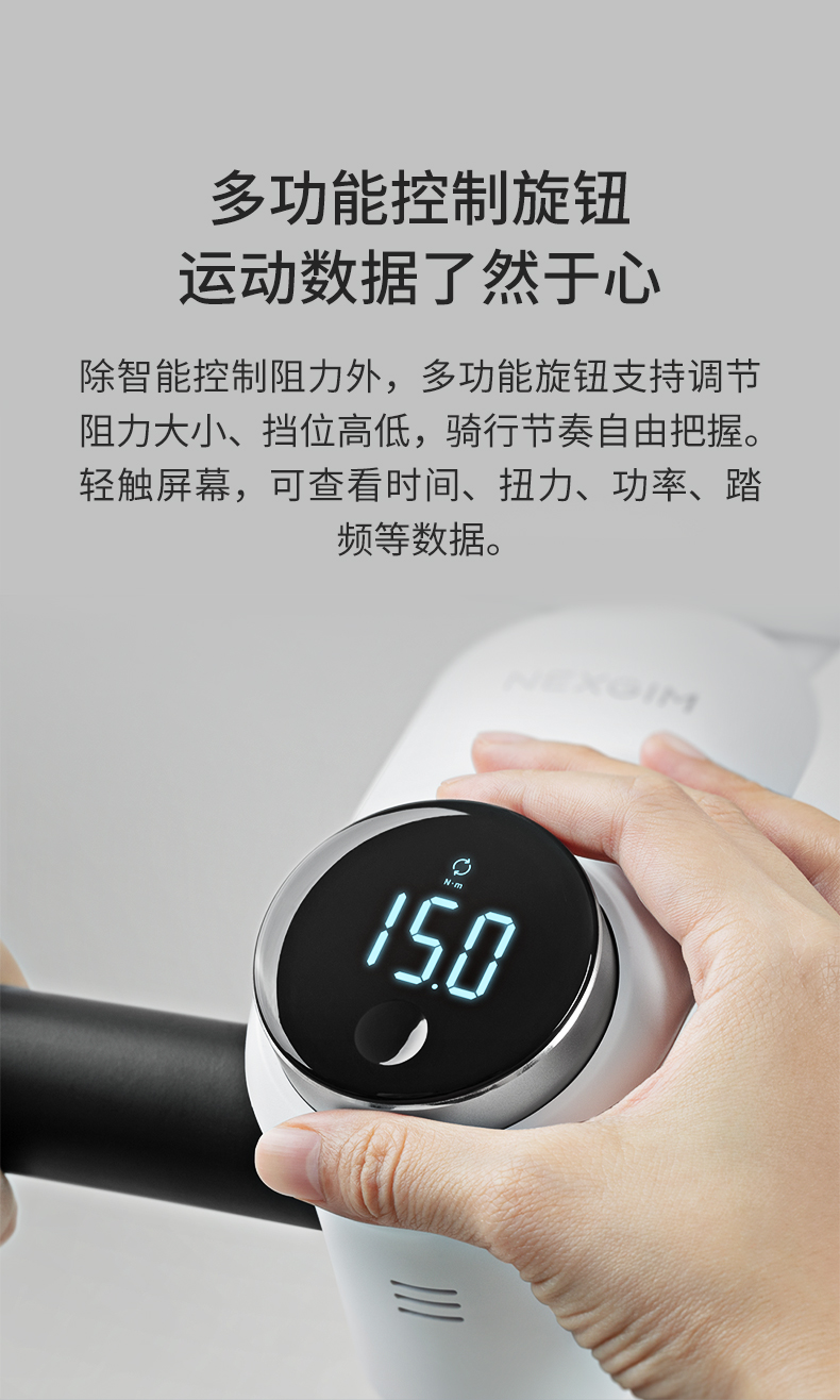 3.调控,除智能控制阻力外,拥有多功能旋钮支持调节阻力大小、挡位高低,骑行的节奏完全自己把握。中控触摸式LED显示屏,可查看时间、扭力、功率、踏频等数据。