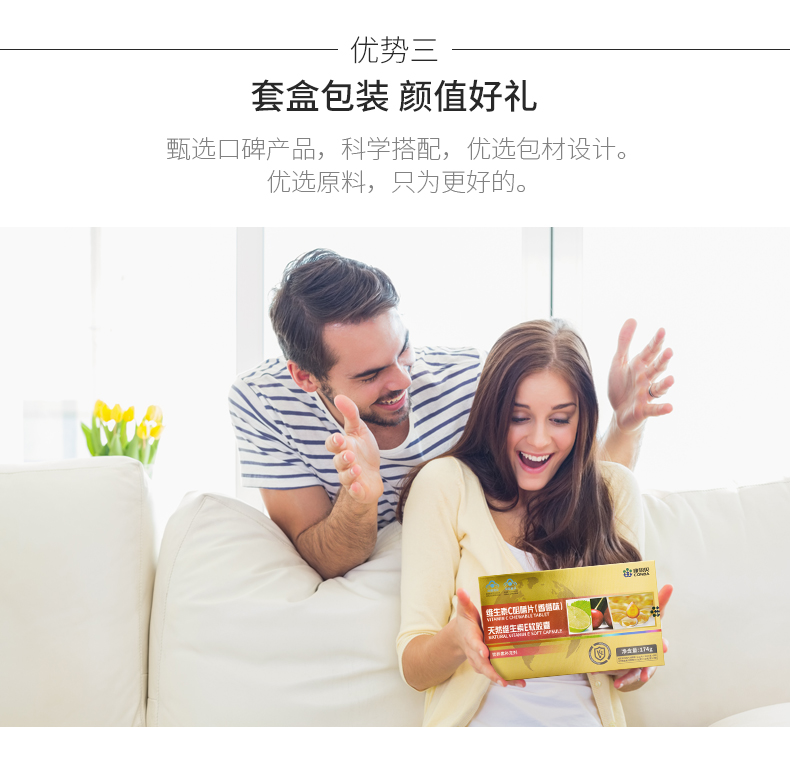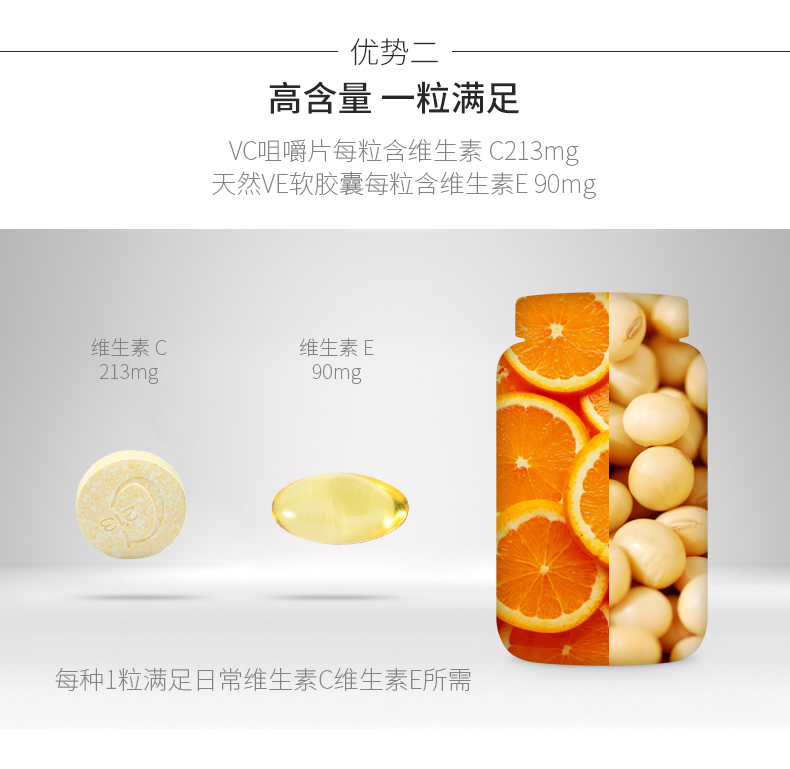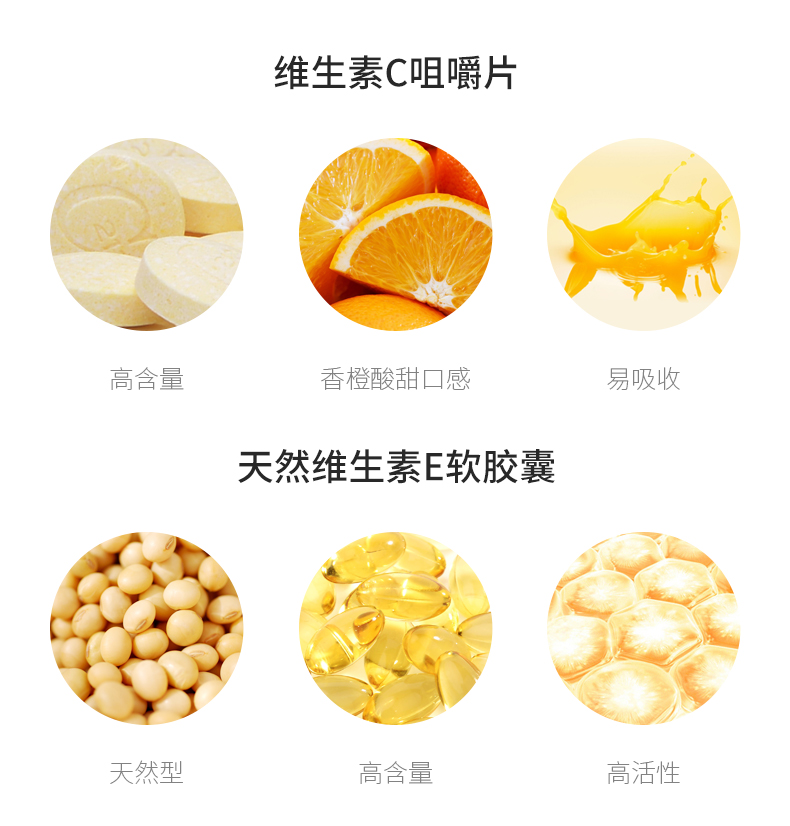 维生素C与维生素E协同作用,共同对抗紫外线与自由基对抗肌肤各种亚健康问题,美白养颜抗衰老,增强抵抗力,提升免疫力。