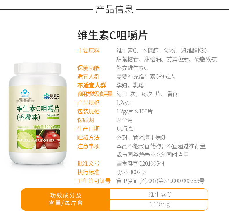 这款康恩贝拥有国家颁布的蓝帽子认证,可在国家食品药品监督管理局查询到。维生素C咀嚼片每粒含维生素C 213mg、维生素E软胶囊每粒含维生素E 90mg,两者共同服用,满足身体所需,同时搭配好吸收。