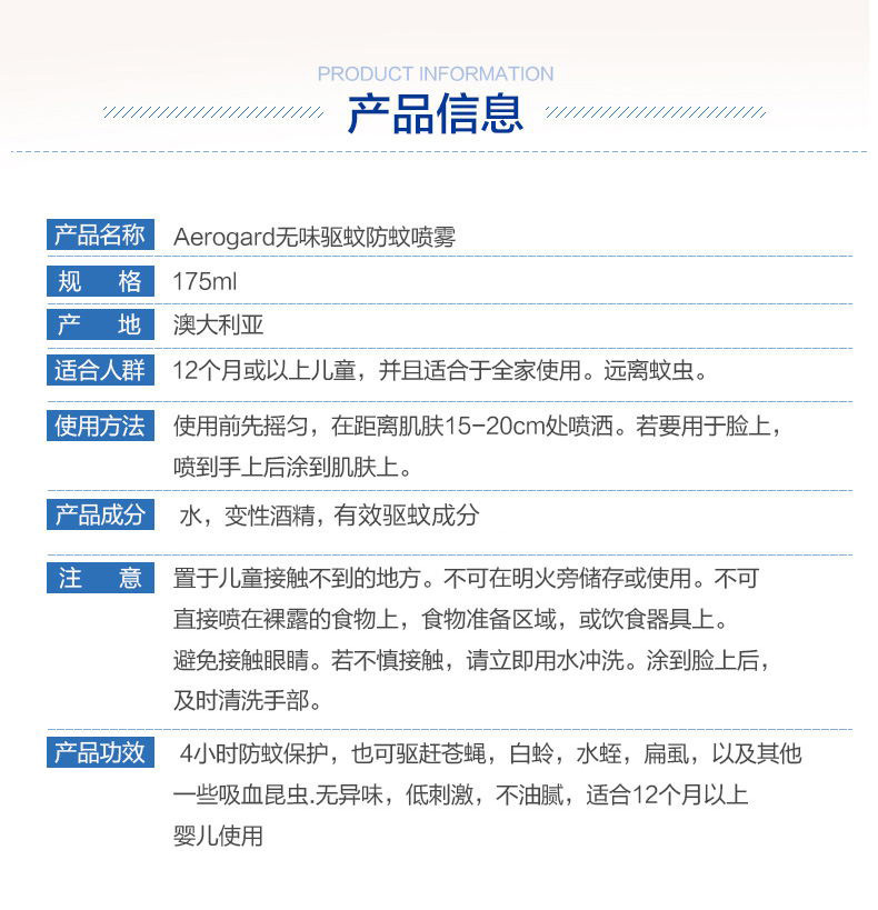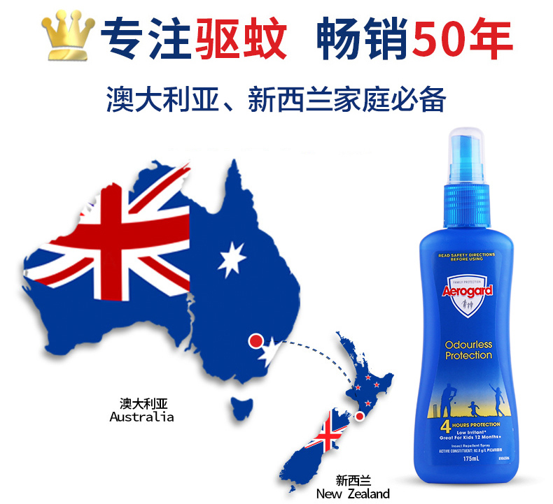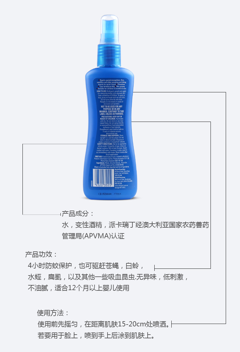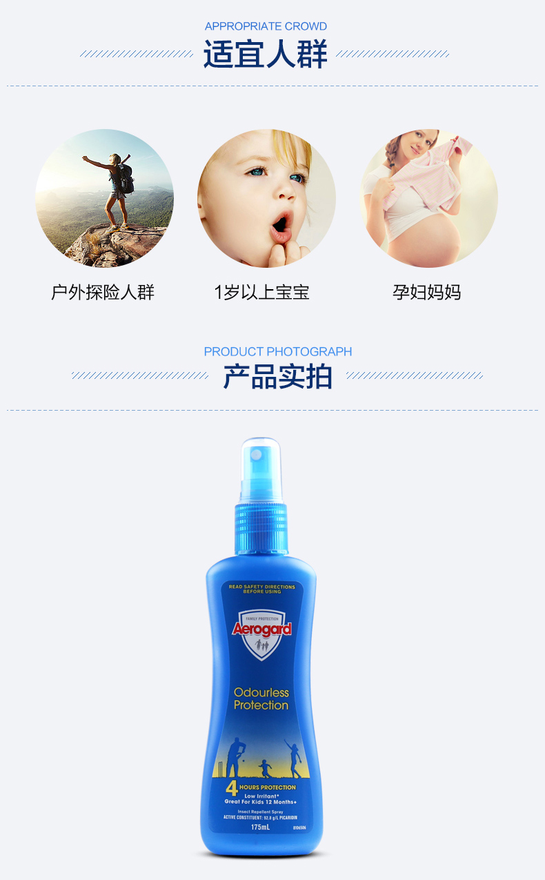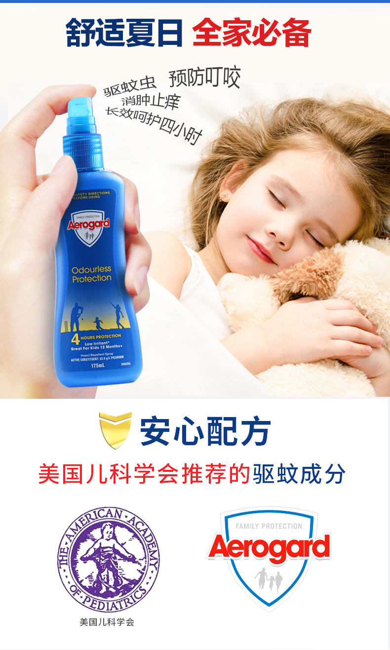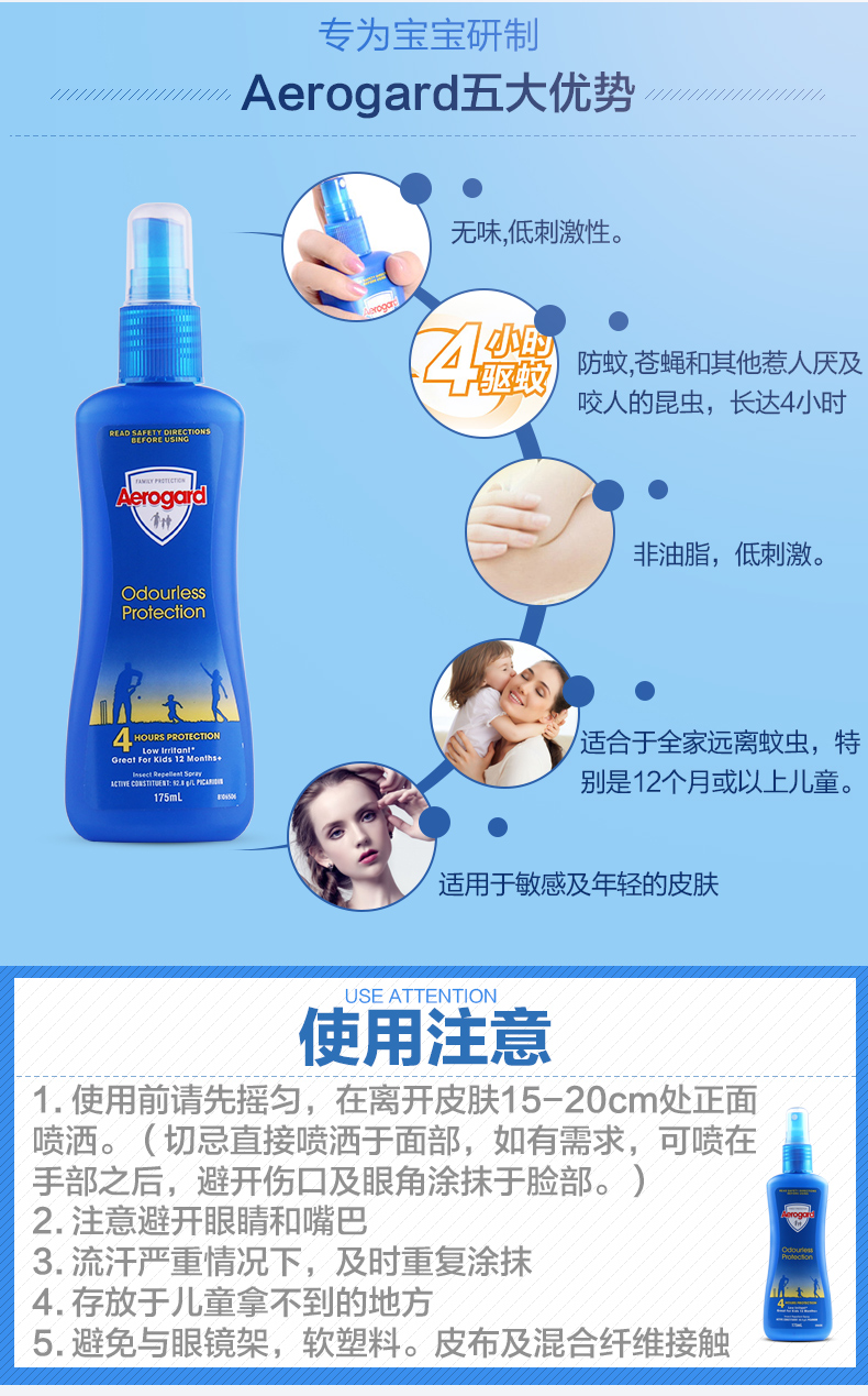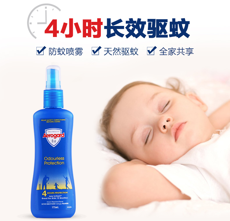 Aerogard是英国利洁时旗下品牌,使用10.3%埃卡瑞丁(派卡瑞丁)作为驱蚊成份,无味,不油腻,驱蚊效果4小时,对苍蝇、白蛉以及其他虫子同样有效。适合1岁以上儿童使用,使用前请先摇匀,在距离15-20cm处,可直接喷在暴露的皮肤上。