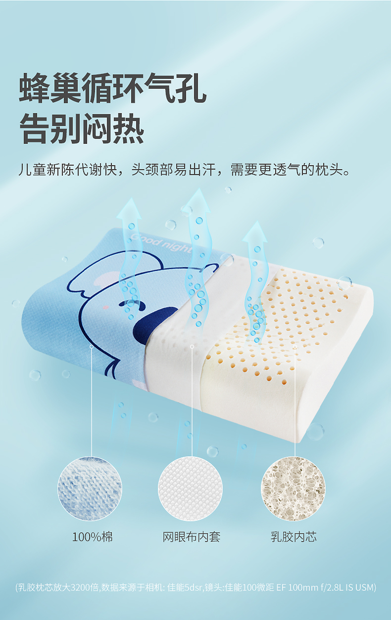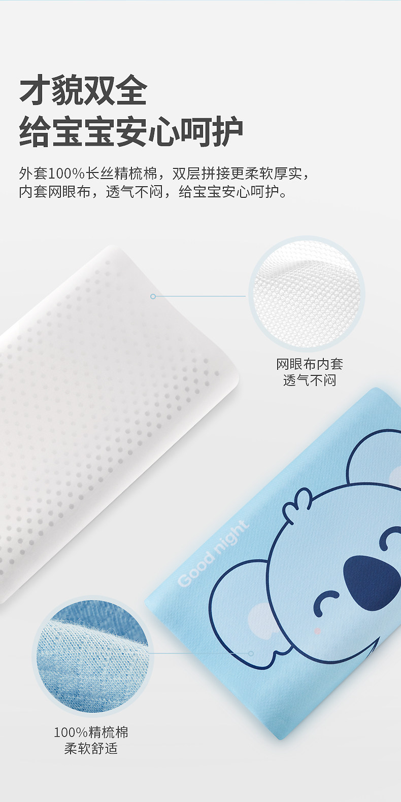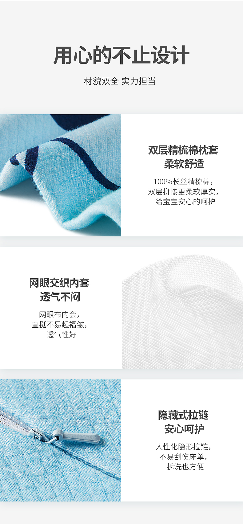 配有网眼内套、和外层枕套。枕套采用100%长丝精梳棉,双层拼接更柔软厚实,亲肤透气性,给宝宝安心的呵护。