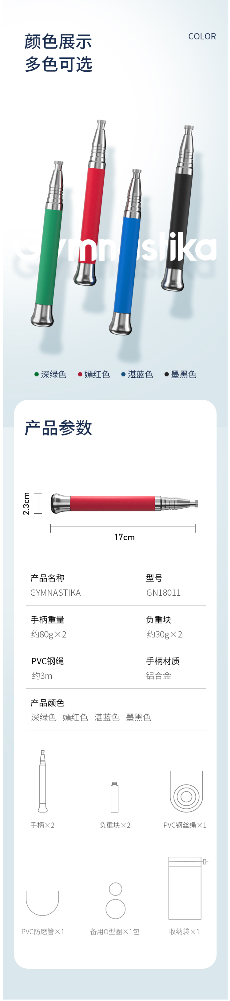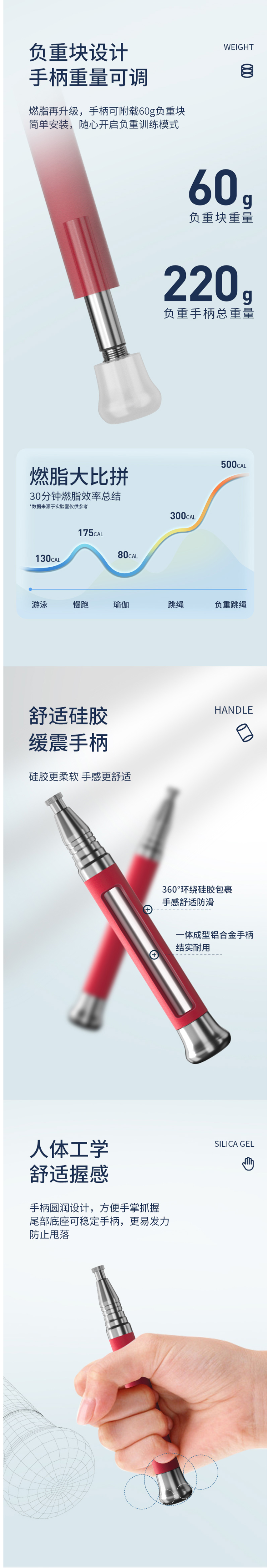 手柄重量约80g*2、负重块约30g*2、PVC钢绳约3m。