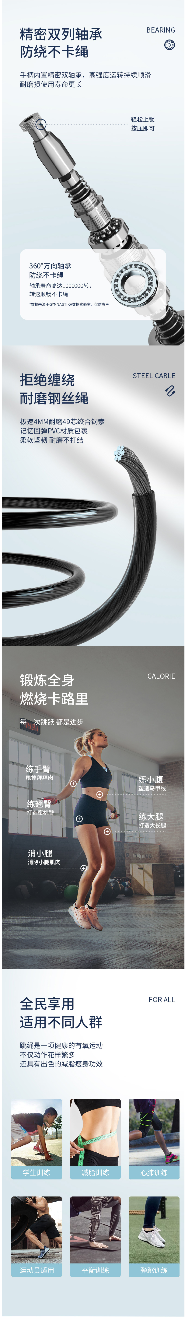 手柄里还内置精密双轴承,高强度运转持续顺滑,不会有卡绳的情况发生,耐磨损使用寿命也更长。极速4mm耐磨49芯绞合钢索,记忆回弹PVC材质包裹,柔软坚韧耐磨不打结。