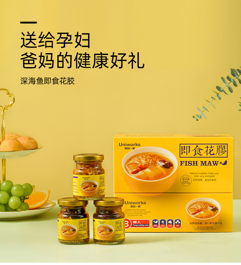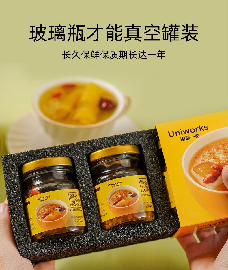 选用的深海野生鱼胶的胶质肥厚,有超过70%的固形物,无腥味,脂肪低,口感Q弹,吃起来滑而不腻,不添加防腐剂、添加剂,可以开盖即食,也可加入鲜奶、蜂蜜、水果一起食用,添加具有益气补血、滋阴补颜的功效,男女老少都可服用,规格75g*3瓶。