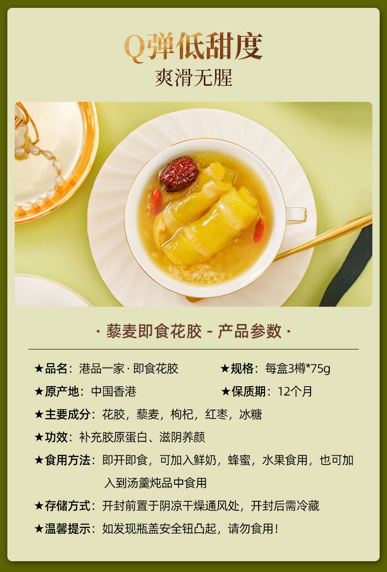 这款港品一家 即食红枣藜麦鱼胶,香港生产,选用深海野生鱼胶为原料,搭配藜麦、红枣、枸杞等补材制成,所有原料全面通过香港卫生署的安全检测,保证质量安全靠谱。