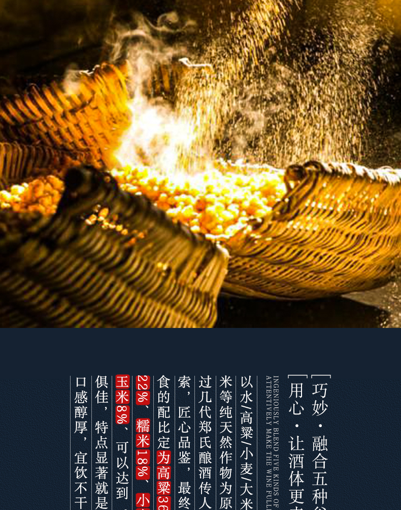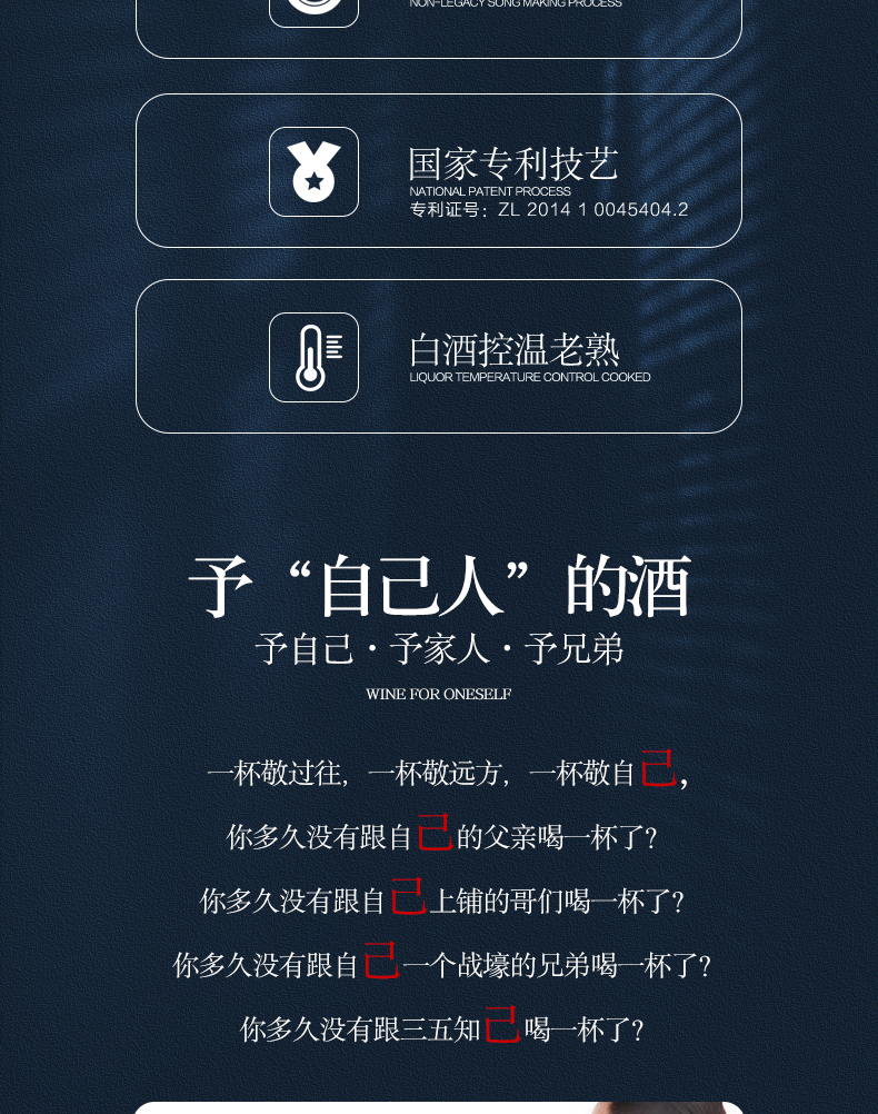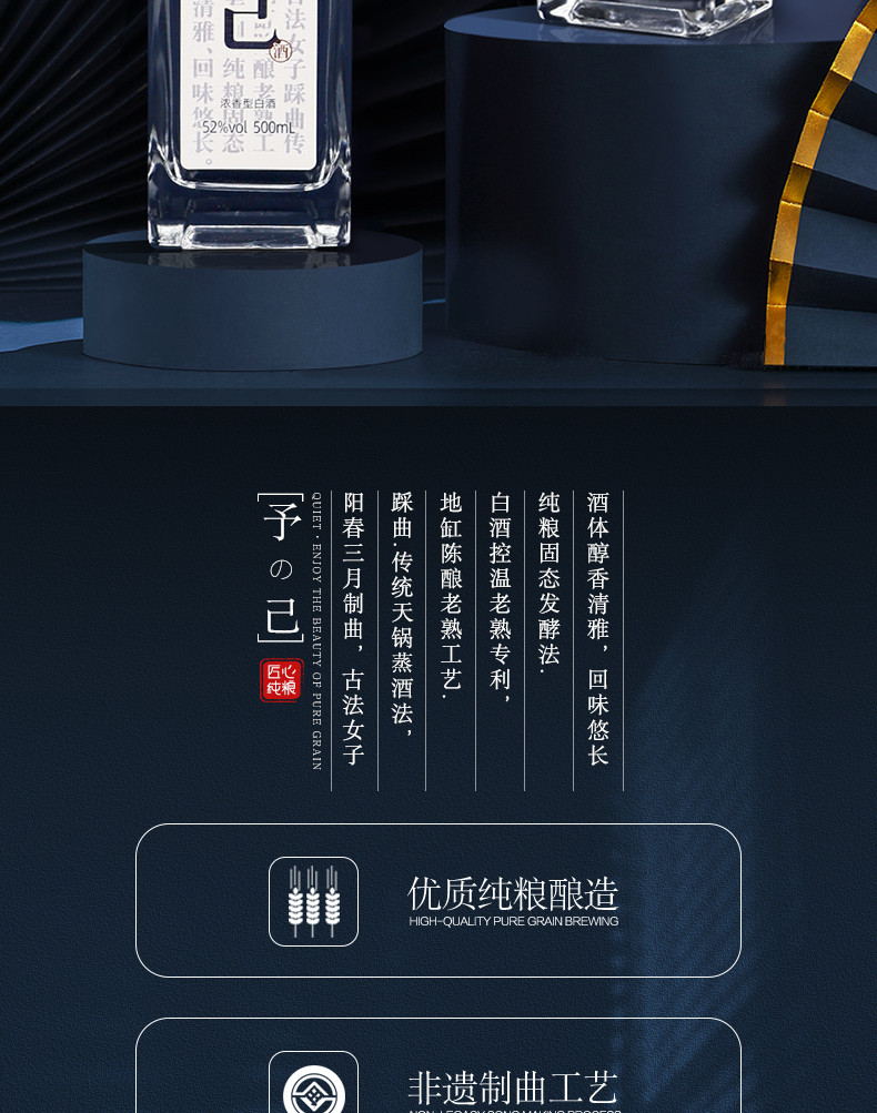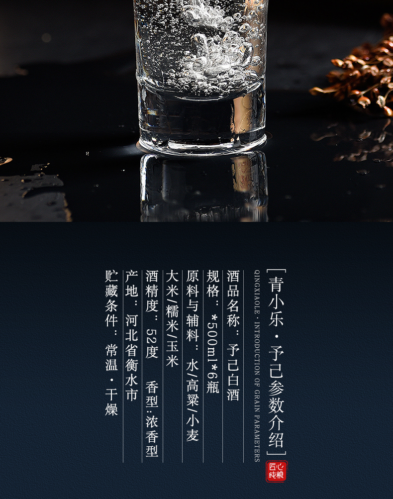 这款青小乐予己浓香型白酒,由衡水义庆隆酒业集团衡水江源酒业有限公司出品,以高粱、小麦、大米、糯米、玉米为原料,遵循古法,采用非物质文化遗产制曲工艺,手工酿造而成,醇香清雅、醇厚甘冽,回味悠长,酒精度52%vol,净含量500ml/瓶,足量1斤。