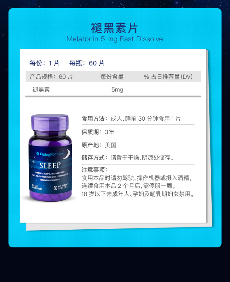 这款PipingRock 褪黑素,美国进口,速溶形式,快速起效。不含糖,人工色素,香精、防腐剂、与至敏物质、不含人工激素、药品和违禁物质,可以改善睡眠质量,稳定人体内环境,改善内分泌系统,提高免疫力,适合难以入睡,长期熬夜、倒时差,多梦易醒的人群。