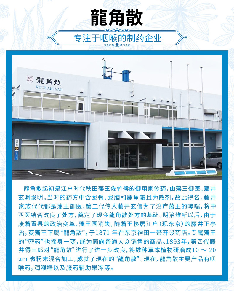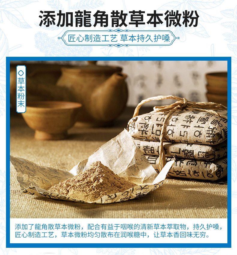 龙角散是由18种草药精华制成,包括薄荷、菊、菩提叶、甘草、麝香草、荔枝草、八角、桉叶、车前子、接骨木花、锦葵、茴芹、蓍草、柠檬香蜂草、枣、金银花、温州橘皮、桔梗。