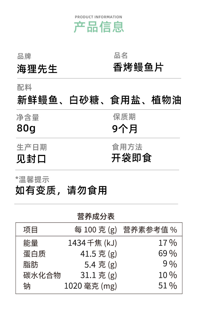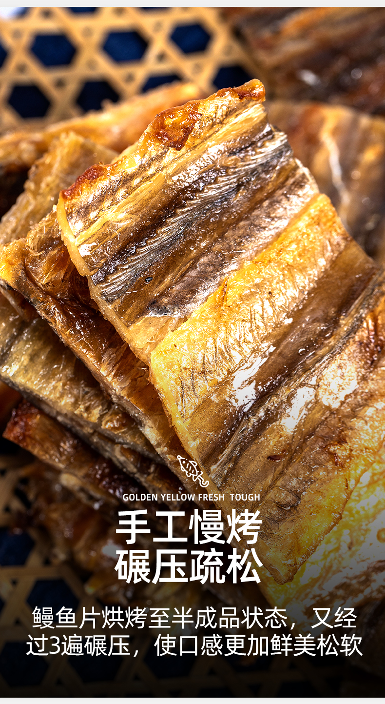 这款日式香烤鳗鱼片,精选优质新鲜鳗鱼为原料,手工慢烤,烤至半成品在经过3遍碾压,鱼肉纤维肉丝清晰可见,制作过程不加淀粉、防腐剂,口感疏松鲜美,味淡而不腥,孕妇也可放心食用。