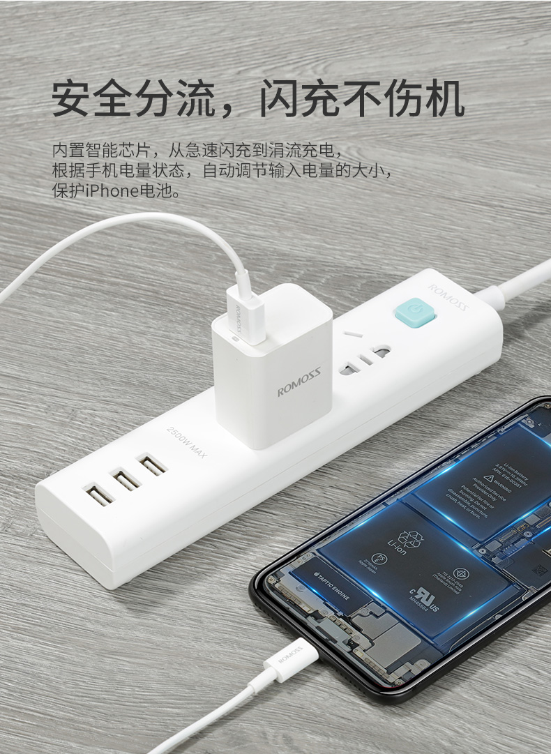 这款罗马仕 Lighting 数据线,线长1m,兼容IOS 9、10、11、12系统,内里是优质纯铜芯,能有2A电流,充电会更快。内置智能芯片可以从急速闪充到涓流充电,还能根据手机电池容量大小,自动调节输入电量的大小,保护电池。