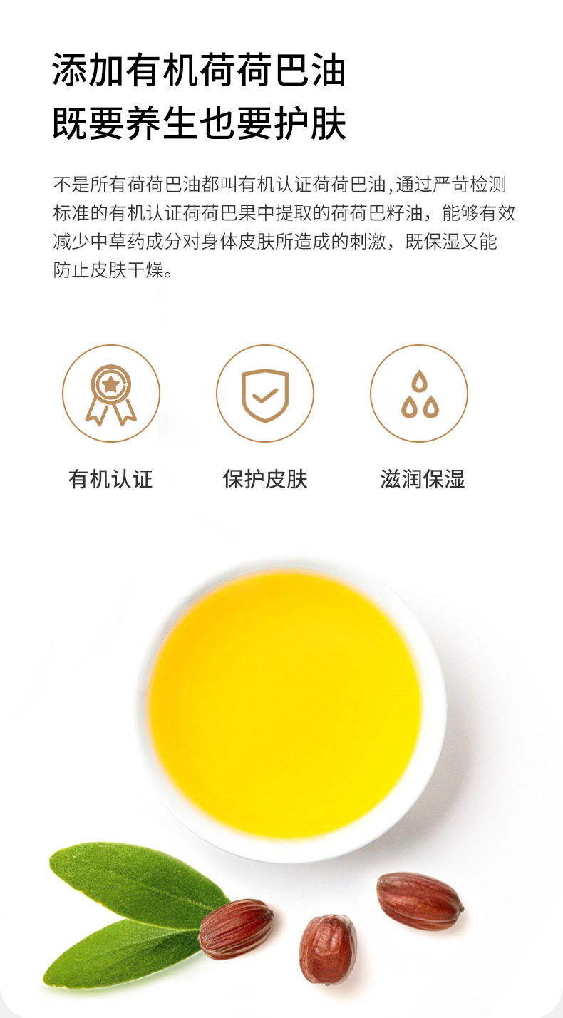 通过严苛检测标准的有机认证荷荷巴果中提取的荷荷巴籽油,能够有效减少中草药成分对身体皮肤所造成的刺激,既保湿又能防止皮肤干燥。
