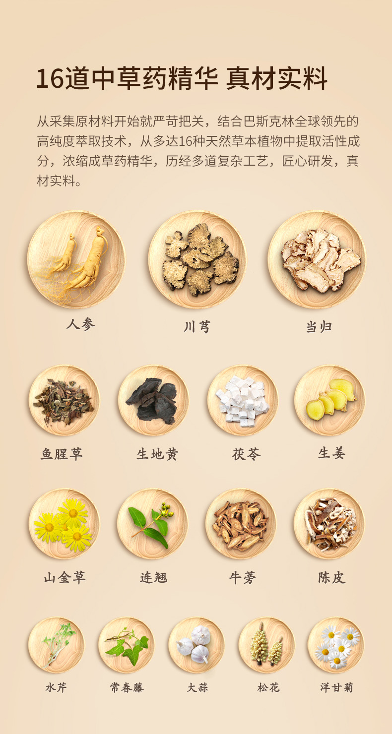 16种中草药成分包括人参、川芎、当归、鱼腥草、生地黄、茯苓、生姜、山金草、连翘、牛蒡、陈皮、水芹、常春藤、大蒜、松花、洋甘菊。