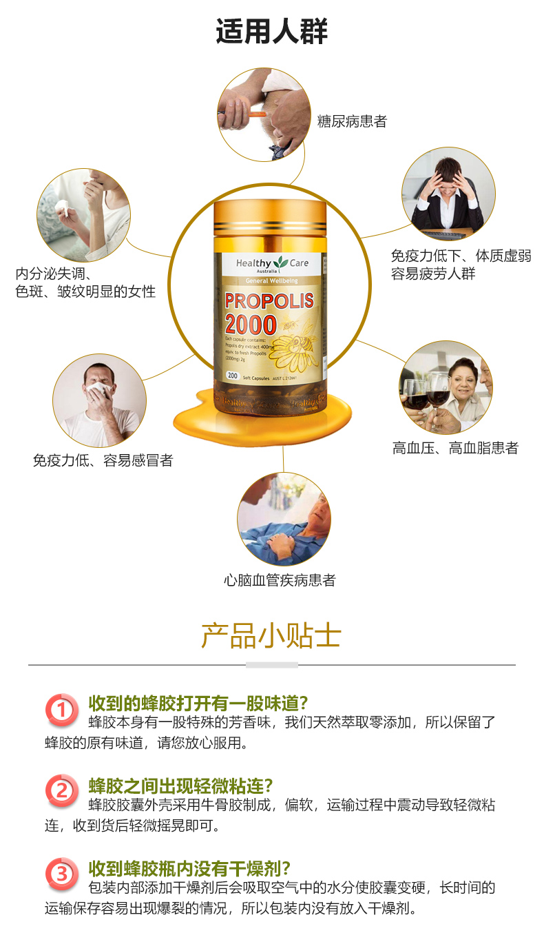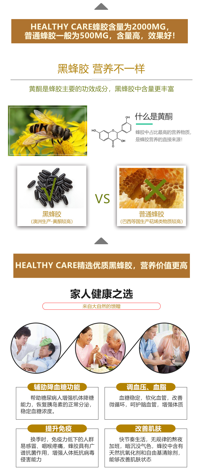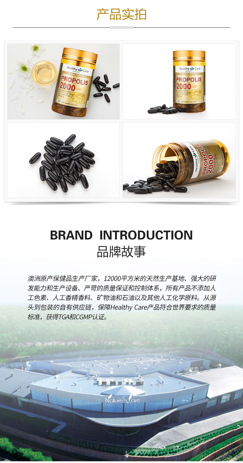 这款Healthy Care黑蜂胶软胶囊,澳洲原装进口,每粒胶囊相当于蜂胶2000mg,黄铜含量每粒约13.5%,相比普通蜂胶含量更高,营养更丰富,通过了澳洲药物管理局TGA认证,规格是200粒,每日1粒。不适合12岁以下儿童、孕期以及哺乳期妇女。