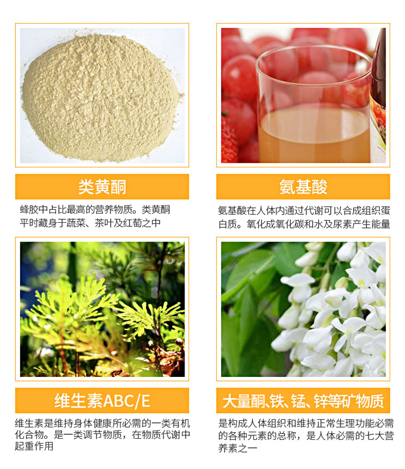 澳洲黑蜂胶产量稀少,内含20大类共300余种营养成分。代表性的活性物质是黄酮类化合物中的槲皮素、萜类及有机酸中的咖啡酸苯乙酯,蜂胶是不可多得的珍贵营养物质。