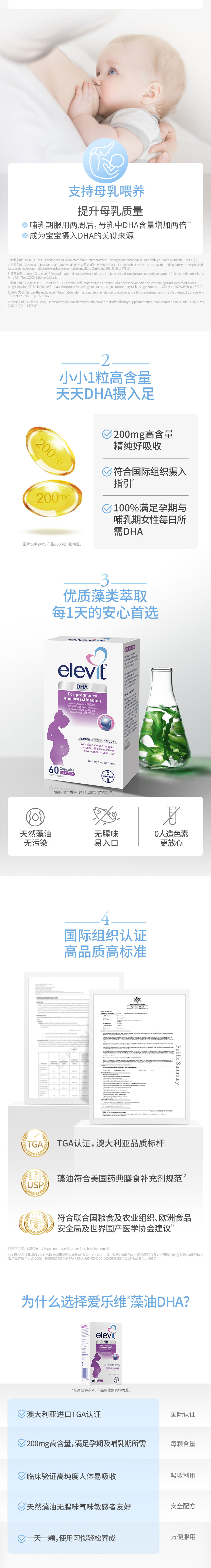这款藻油DHA软胶囊 澳洲进口,TGA认证,符合美国药典膳食补充剂规范,1小粒200mg高含量,优质藻类萃取,天然无污染,无腥味易入口,0人造色素更放心。哺乳期服用2周后,提升母乳质量,促进宝宝大脑与视力发育。