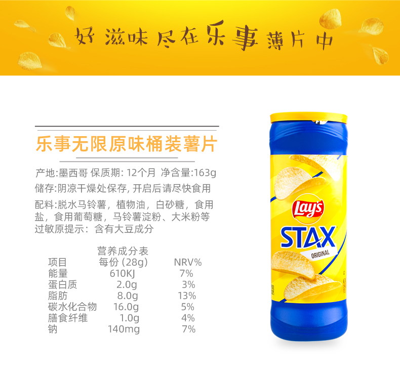 味道上有:乐事无限原味桶装薯片 163g*2桶乐事无限醋盐味桶装薯片 155.9g*2桶乐事无限醋盐味桶装薯片 155.9g + 乐事无限原味桶装薯片 163g