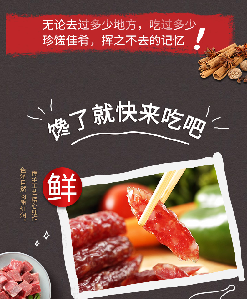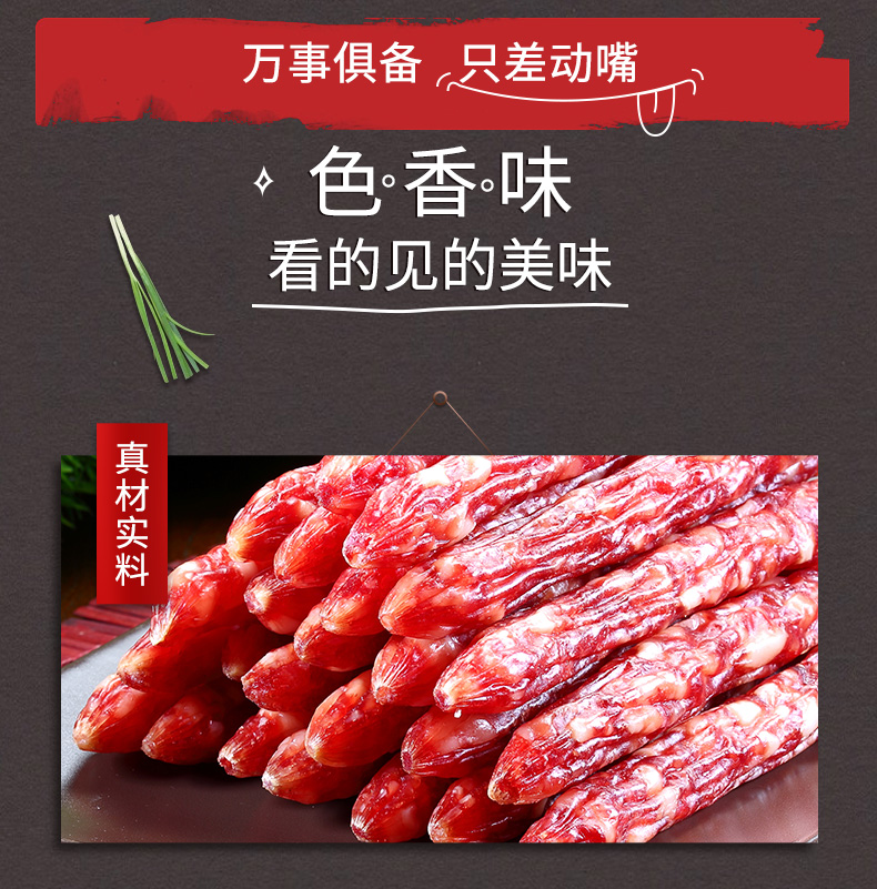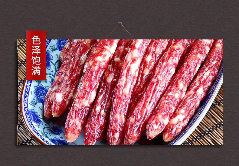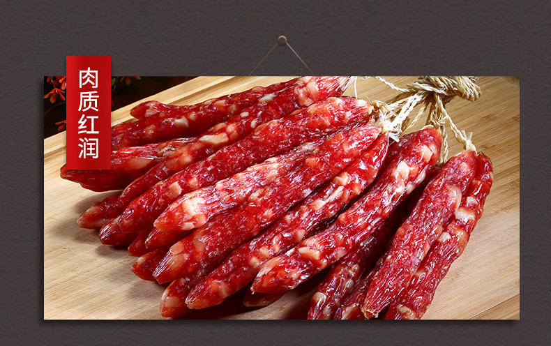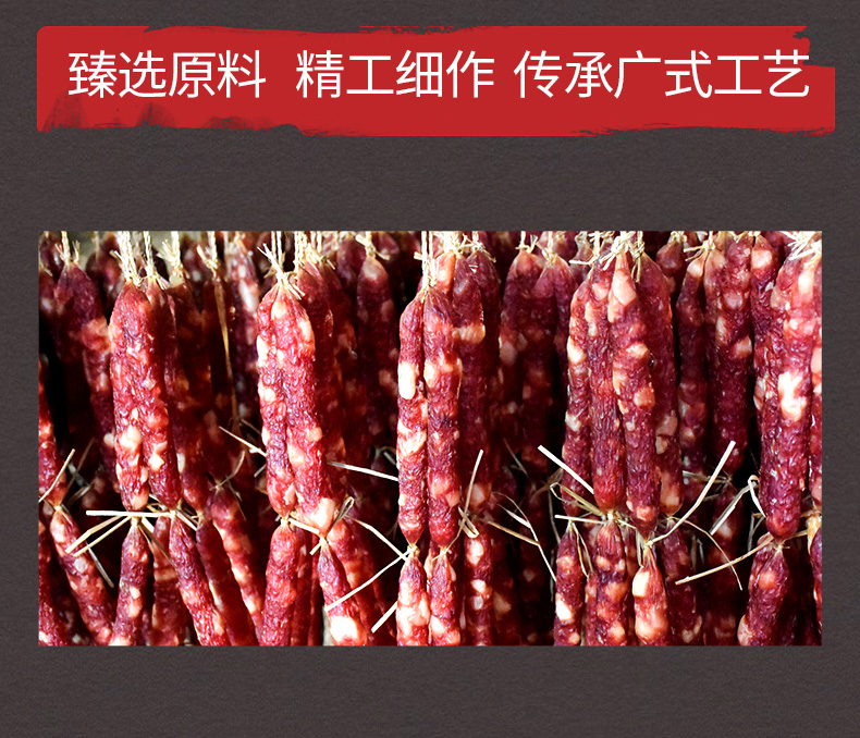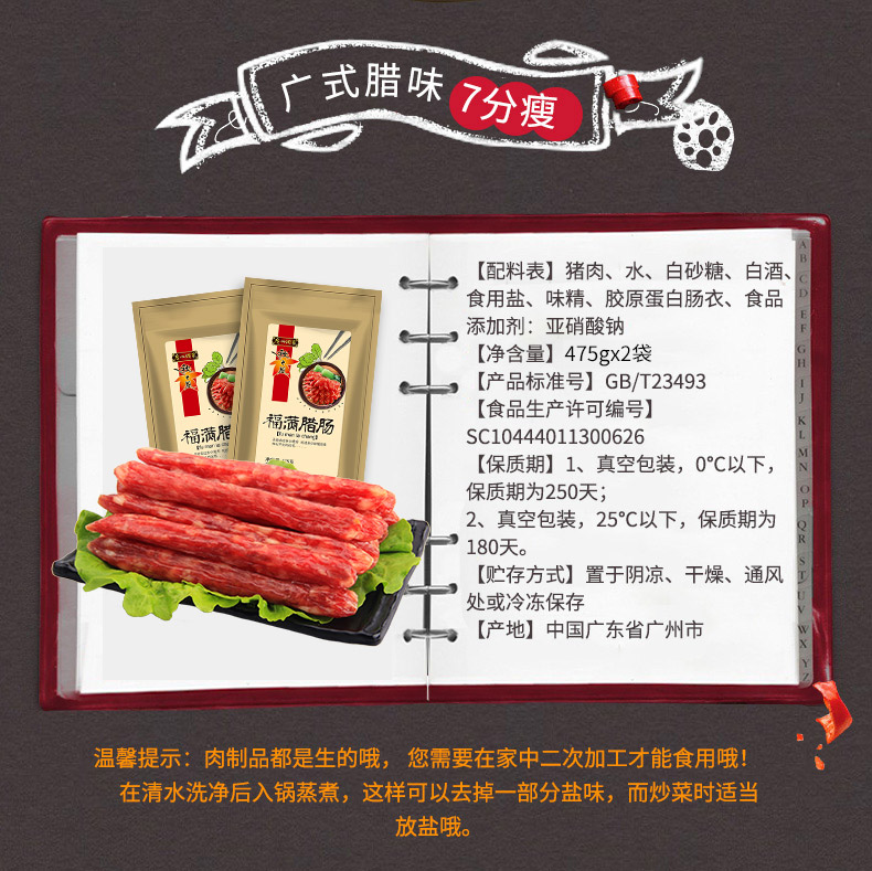 这广州酒家 7分瘦福满腊肠,是经典的广式口味香肠,相较于川式腊肠的麻辣及熏烤的味道,广式腊肠则加入较多的蔗糖和酒。