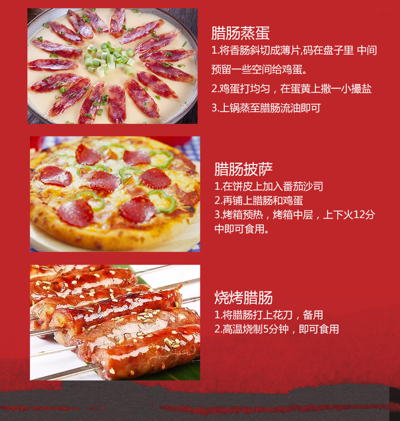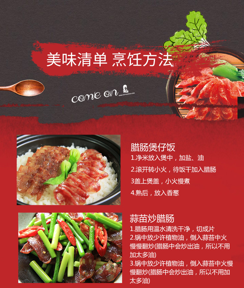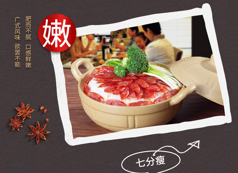 使用纯猪腿肉制成—7分瘦、3分肥,色泽鲜明,表面干爽不油腻,传统工艺加上先进的烘焙技术,经典广式口味,微带甜味,咸甜适中,有酒香,口感有韧劲,非常适合炒菜、煲饭等等,可作凉菜、拌炒、蒸煮均可。
