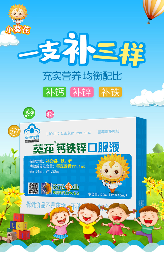 每支含钙111.1mg、铁2.04mg、锌1.33mg。葵花药业,线下药店都有卖,钙铁锌口服液儿童成长补钙,宝宝葡萄糖酸钙锌口溶液,一支补三样,补钙,补锌,补铁,大人小孩同补,液体钙易吸收。领券链接点此