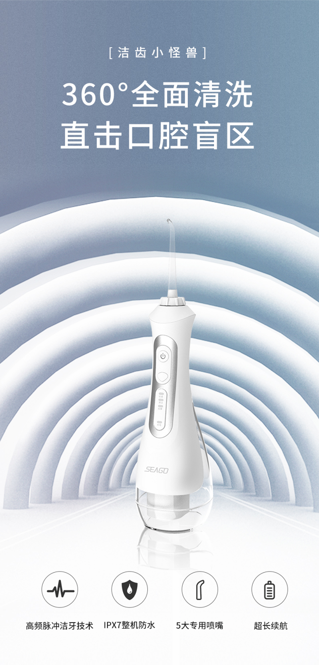 赛嘉清新便捷式冲牙器,内置优质水泵,可形成2000次/分钟脉冲水流,80-160psi水压,水流强劲安全,洁齿高效舒适有轻柔模式、清洁模式、按摩模式三种模式可选,智能记忆,无需反复切换,整机IPX7级防水,洗澡时也可使用,水箱可拆卸设计,方便及时清理,防止滋生细菌,洁齿更卫生。