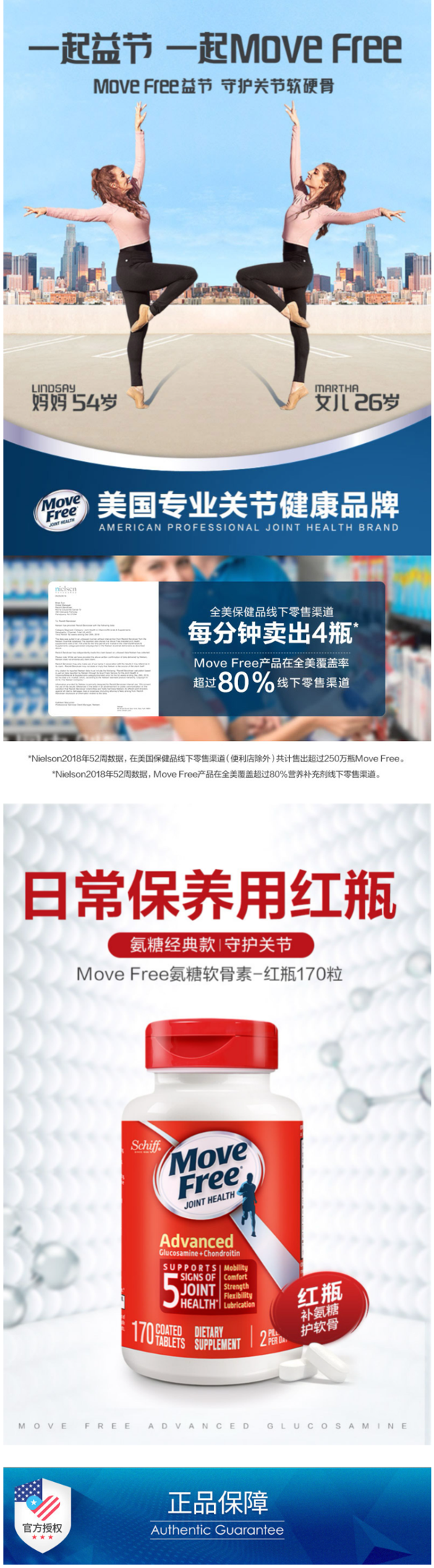 Move Free维骨力,是美国关节保健品市场上的第二大品牌,母品牌Schiff有近80年历史。Move Free最大的特点,是针对骨关节保健盲区“软骨”进行营养补充,核心营养素是“氨基葡萄糖”,也叫氨糖,美国有专门的医疗机构论证过氨糖的有效性。