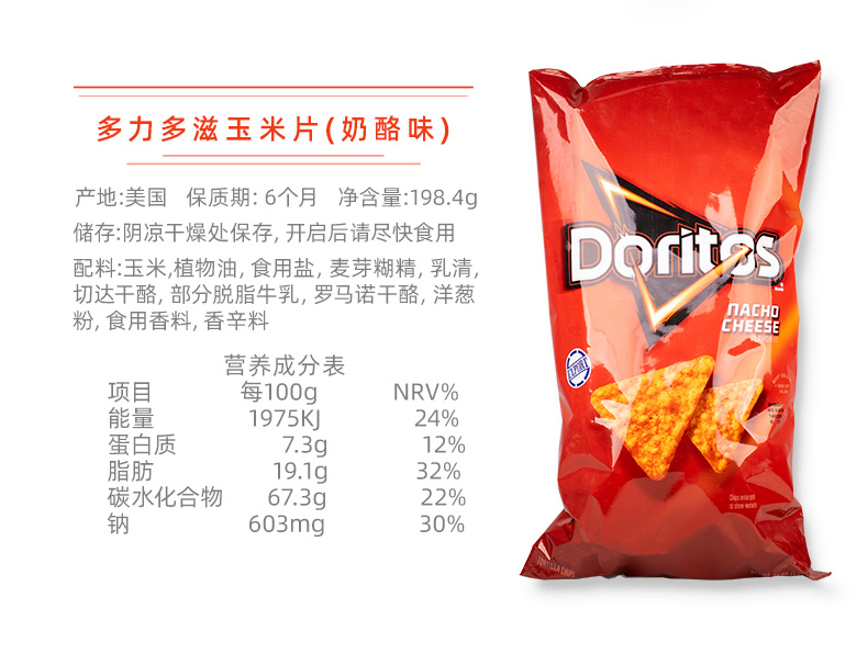 这款多力多滋玉米片是一款膨化薯片,使用本土优质玉米为原料,三角形状,香脆大片,入口咔吱咔吱脆。