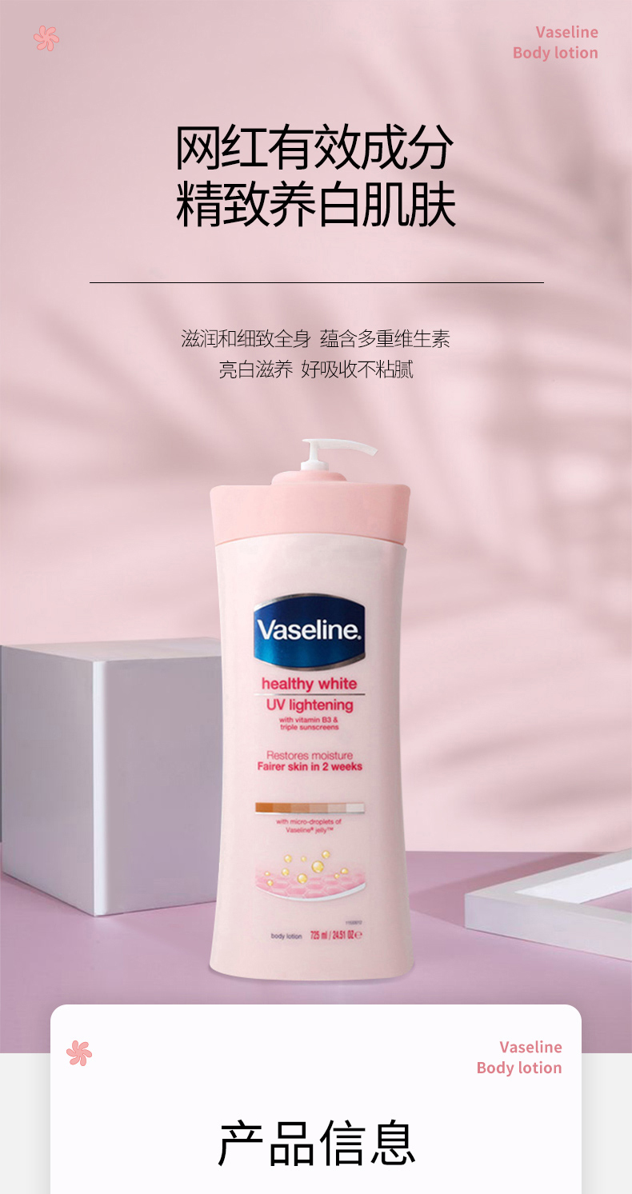 [店铺名]99元,下单立减24.75元,可领5元优惠券,实付69.25元到手,凡士林身体乳,全球著名的保湿产品,采用经典配方,对于干燥肌肤、老废角质均有针对性效果,促进肌肤自愈。新版质地较为轻薄,容易涂抹,依然安全有效,适合干性及中性肌肤,官方建议在沐浴后3分钟内使用。