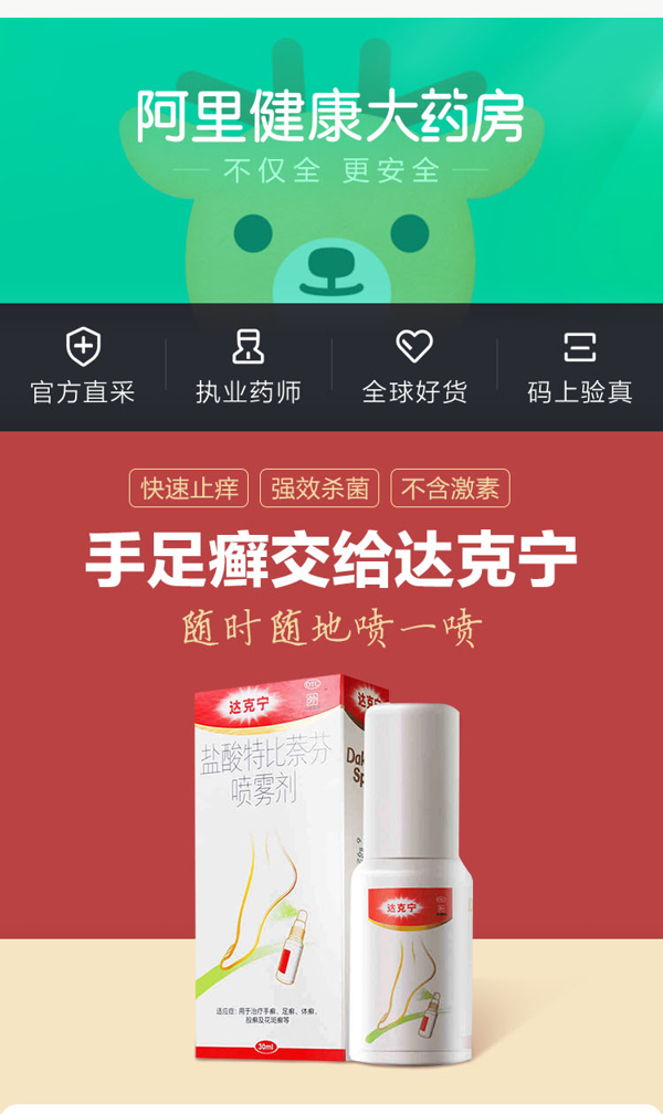 这款达克宁 盐酸特比萘芬喷剂,针对症状专门研制,主要成分盐酸特比萘芬,能深入杀菌专治脚气,液体制剂,特含酒精,喷涂后能快速渗透。