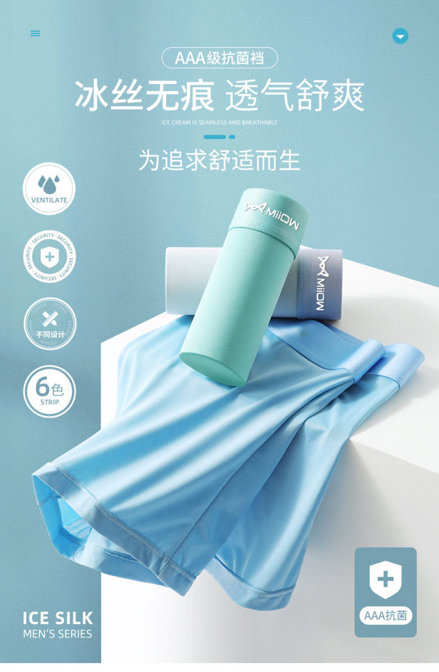 MiiOW 猫人 冰丝平角裤,大身采用87%科技冰丝面料中混入13%弹性纤维。面料高回弹,任意拉伸不束缚,抽针工艺穿着更加舒适,清爽透凉,如同丝绸般爽滑,轻盈舒适,“零感”无负担。