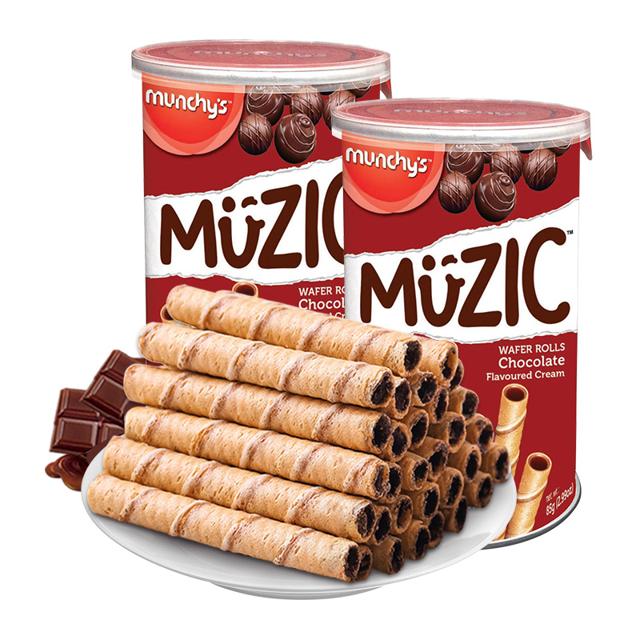 马奇新新 巧克力注芯蛋卷威化饼干,产自马来西亚。巧克力味威化饼,甄选每一种原料,薄脆细卷,注心浆料,彩条巧克力,香醇美味,颜值与美味兼备,可当做早餐,办公室零食,规格:85g*2罐。