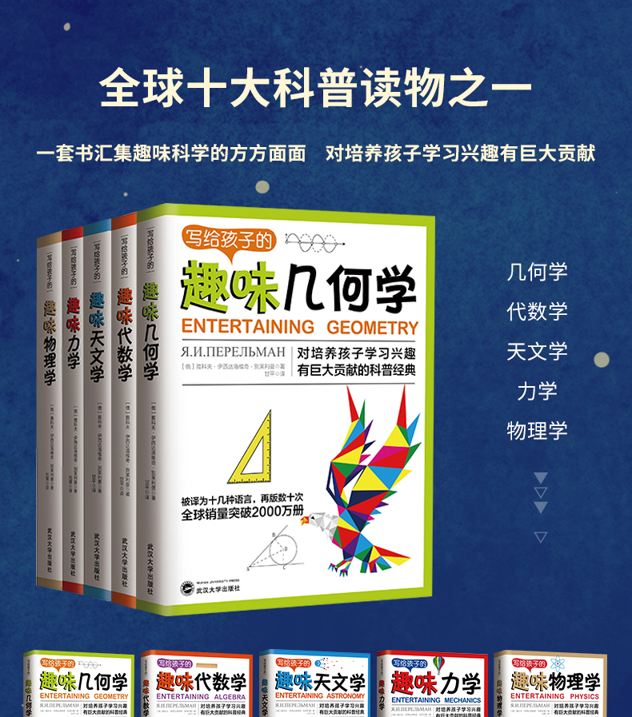 天猫广州青果图书专营店58.8元,可领20元优惠券,实付38.8元到手,包含几何学、代数学、天文学、力学以及物理学,全套5册。