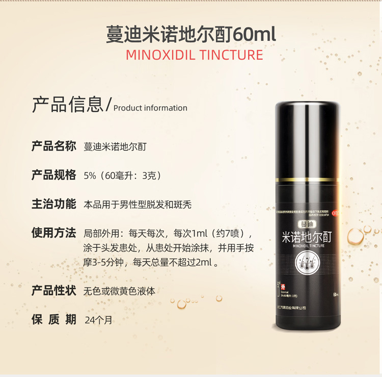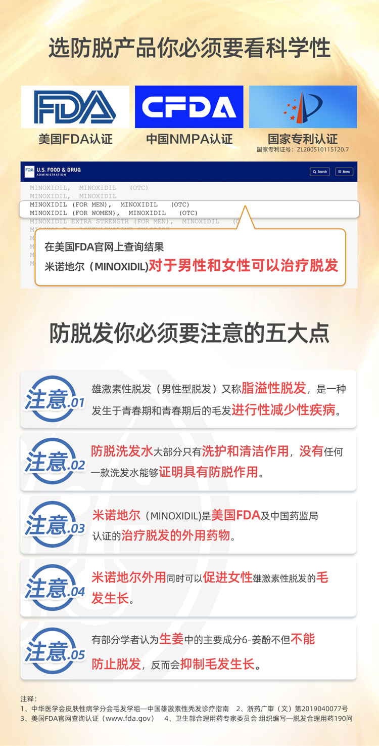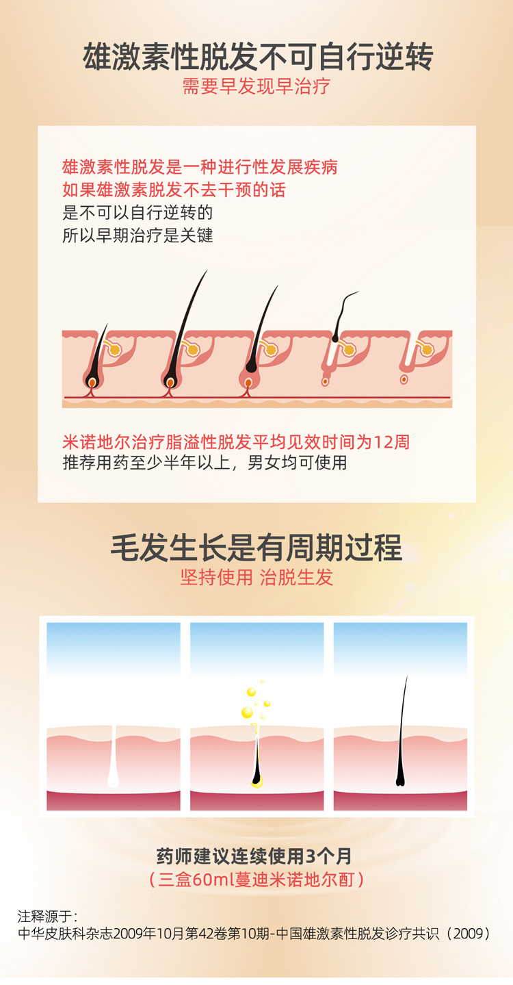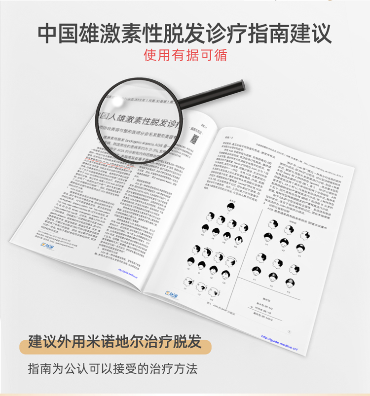 这款是国药准字OTC非处方药,是市面上真实有效的生发药用品,成份为米诺地尔,是一种周围血管舒张药,局部长期使用时,可刺激男性型脱发和斑秃患者的毛发生长。适用于男性雄激素源性脱发、女性雄激素源性脱发、斑秃患者。