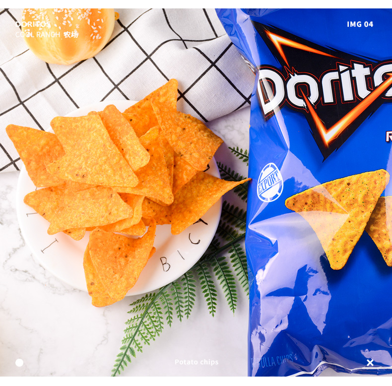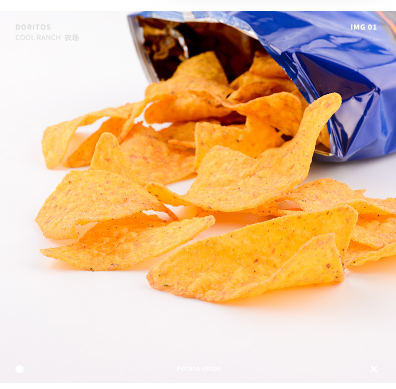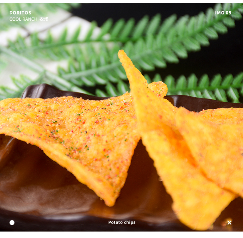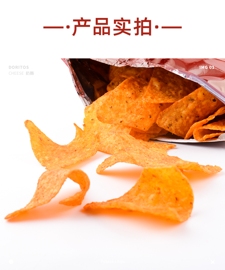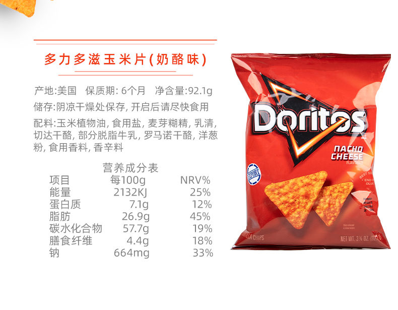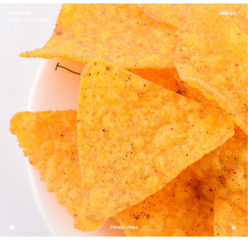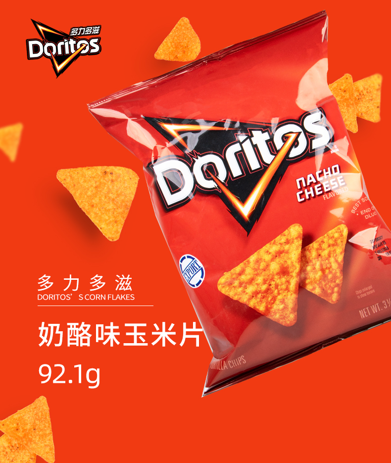 这款多力多滋玉米片是一款膨化薯片,使用本土优质玉米为原料,三角形状,香脆大片,入口咔吱咔吱脆,有奶酪味和农场味可选。