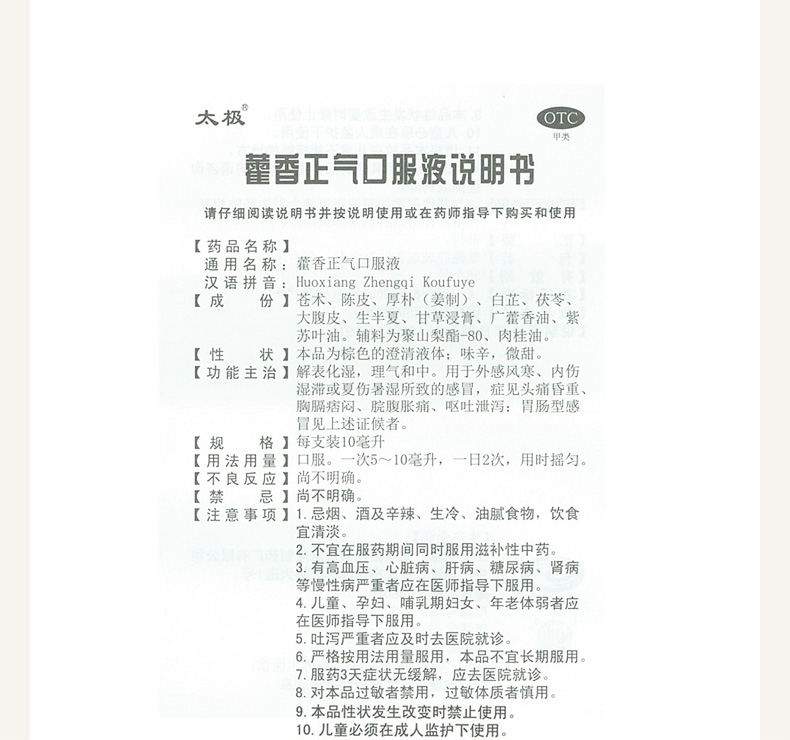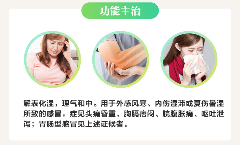 成分:苍术、陈皮、厚朴(姜制)、白芷、茯苓、大腹皮、生半夏、甘草浸膏、广藿香油、紫苏叶油。辅料为聚山梨酯-80、肉桂油。