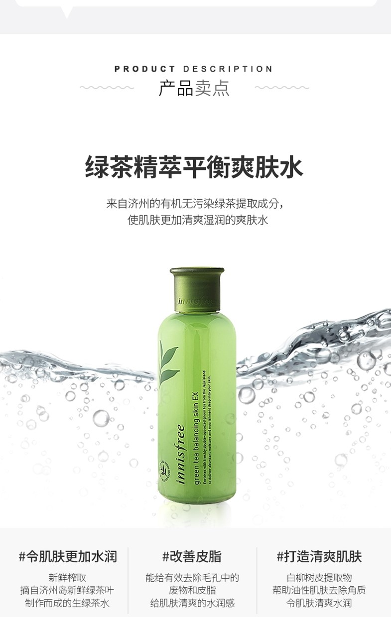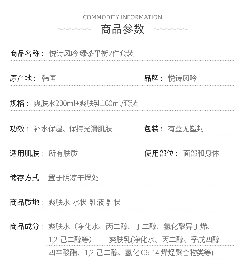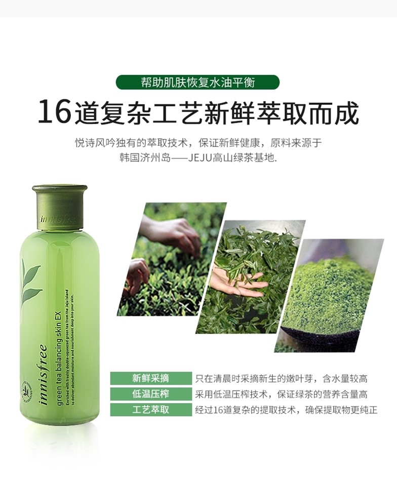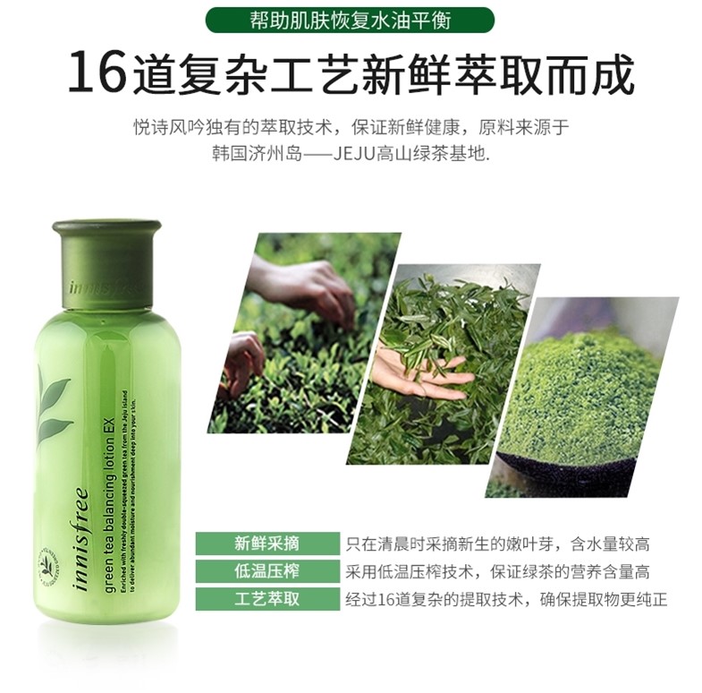 采用天然绿茶茶多酚,清除人体自由基,调节肌肤水油平衡,温润补水,清爽舒适易吸收,敏感肌也可用。悦诗风吟走的就是小清新风格,性价比高,味道清新淡雅,而且算是在中国叫的比较响的化妆品牌子了,简单实用。