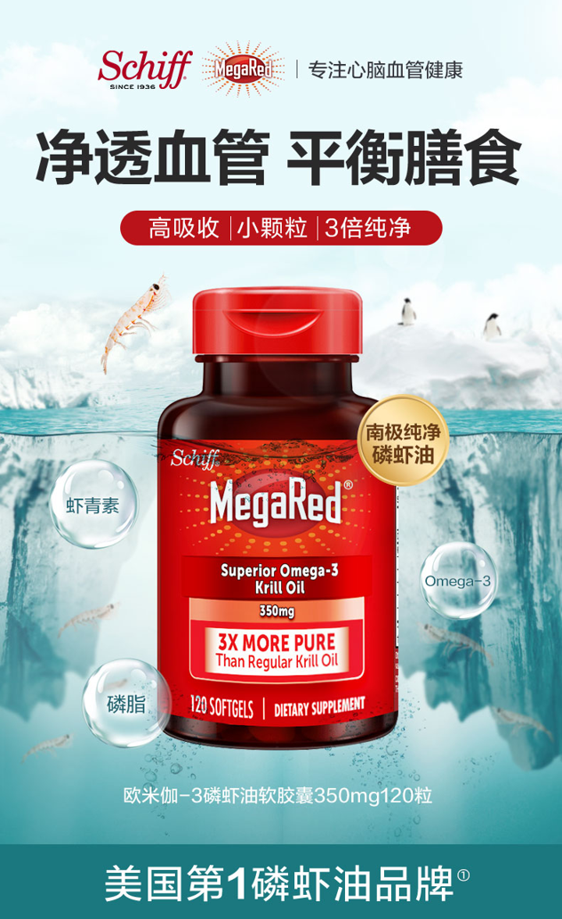 这款Schiff MegaRed 欧米伽3 深海磷虾油胶囊,美国原产,以南极纯净深海的极磷虾为原料,提取磷虾油精华,比鱼油更易吸收,效果更好。