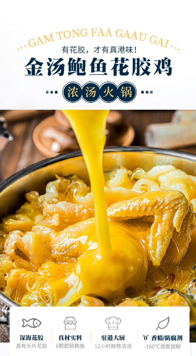精选500天农家散养走地鸡、2MM大片鳕鱼胶、6颗深海鲍鱼、素鱼翅等,6斤新鲜珍肴12小时文武火精心熬制,0香精、0防腐剂、0增稠剂、还原真港味,鲜香浓郁,胶多粘嘴,金灿灿的花胶,让人看着就垂涎欲滴。还可根据个人喜好加入各种配菜,加热即食。