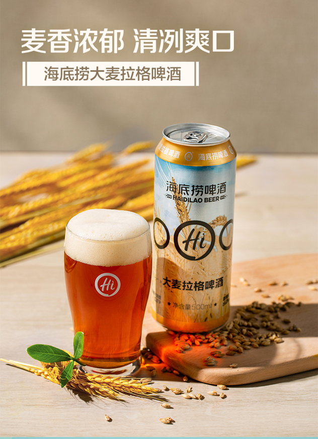 海底捞门店同款的大麦拉格精酿啤酒,优选大麦芽和啤酒花发酵而成,不含大米等,低温发酵,味道纯净浓郁,具有浓郁复合的麦香味道,琥珀色酒体,食欲满满,饮后回甘,具有淡淡甜甜的味道。
