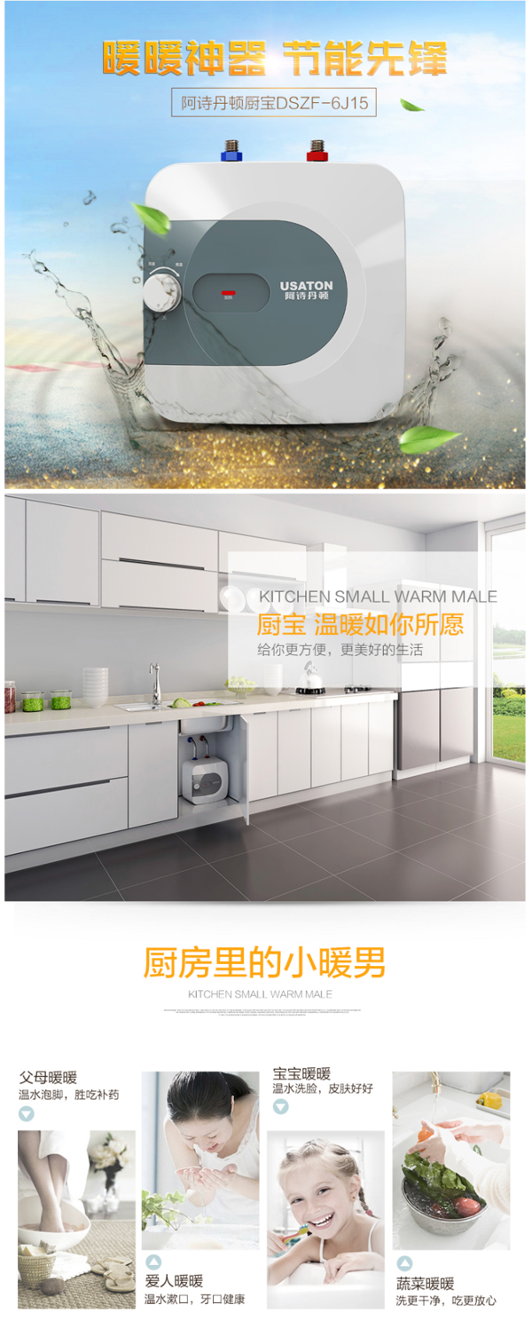 海信阿诗丹顿DSZF-6J15小型厨宝,属于储水式热水器机身一体成型,防水渗入;出热水率80%,一级能效标准。内里是精质搪瓷蓝钻内胆,搪瓷厚度在0.3~0.5mm,耐腐蚀、抗压、高绝缘、防爆炸,经久耐用;